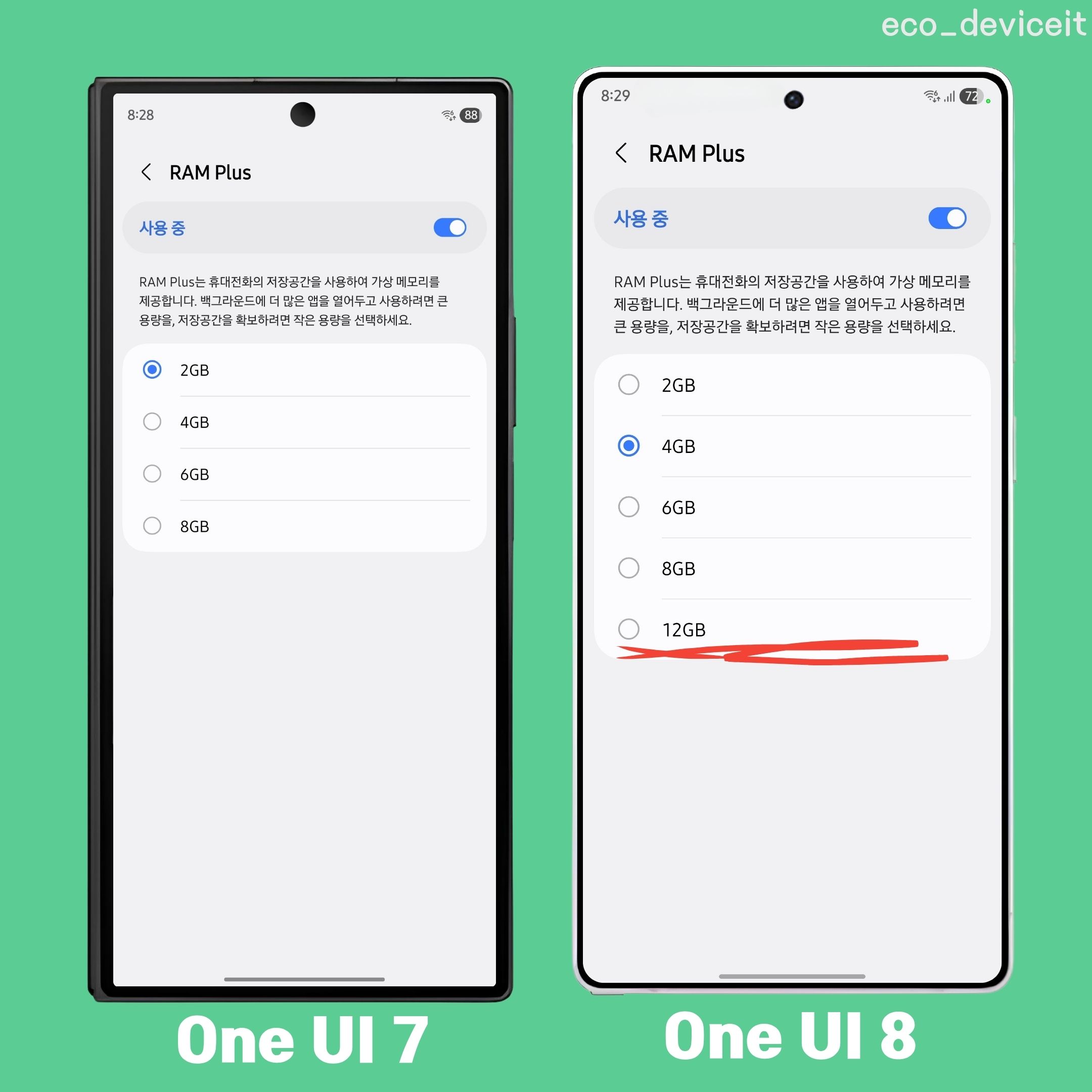 디바이스 케어에 램 플러스에서 One UI 7 까진 8GB까지 지원하였지만, One UI 8부턴 최대 12GB의 램 플러스로 저장공간을 활용할 수 있게 선택권이 넓어졌습니다.