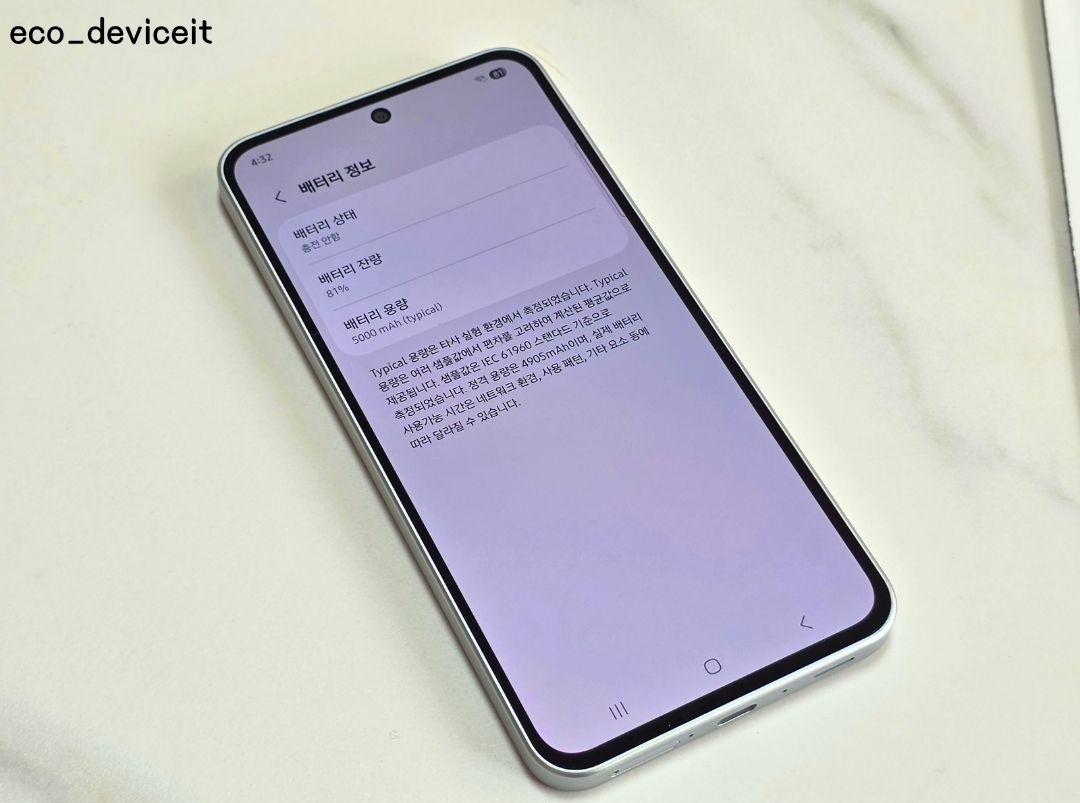 갤럭시 A36 5G 모델의 배터리는 5000mAh의 대용량 배터리로, 갤럭시에서의 최고 모델인 갤럭시 S25 울트라와 동일한 수준의 배터리로 정말 오래갑니다.