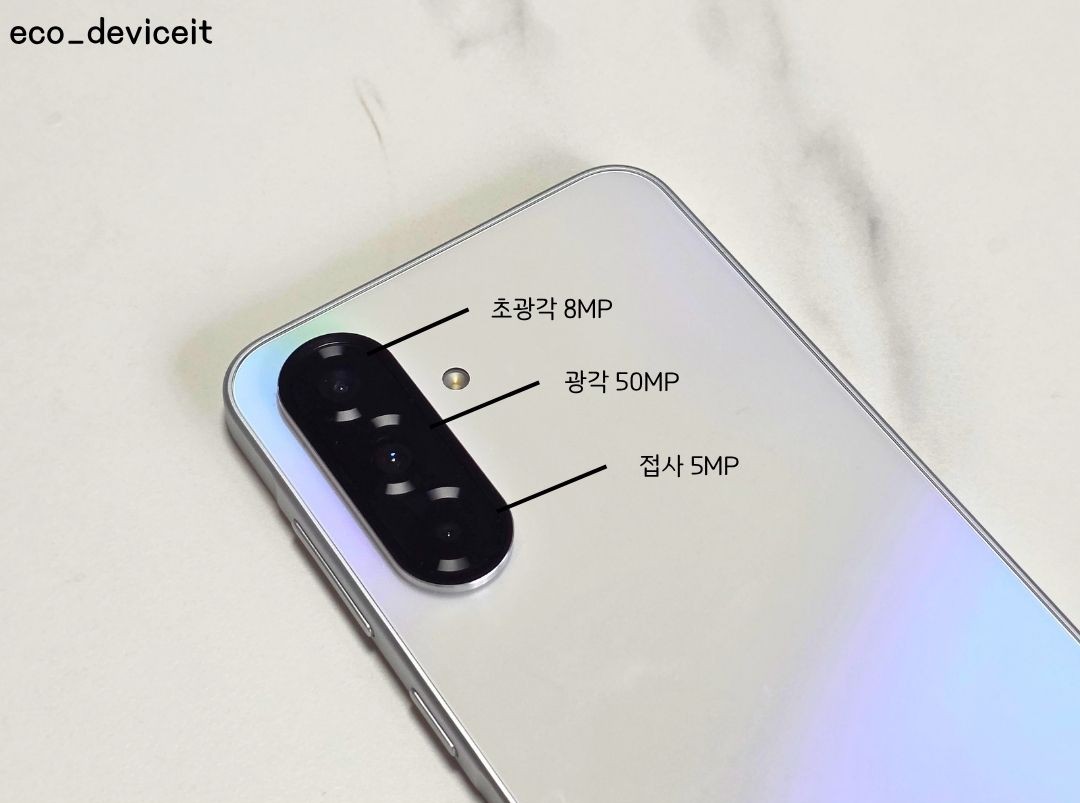 갤럭시A36 5G의 후면 카메라 구성은 상단부터 8MP 초광각, 50MP 광각 그리고 5MP 접사 렌즈로 구성되어 있습니다.