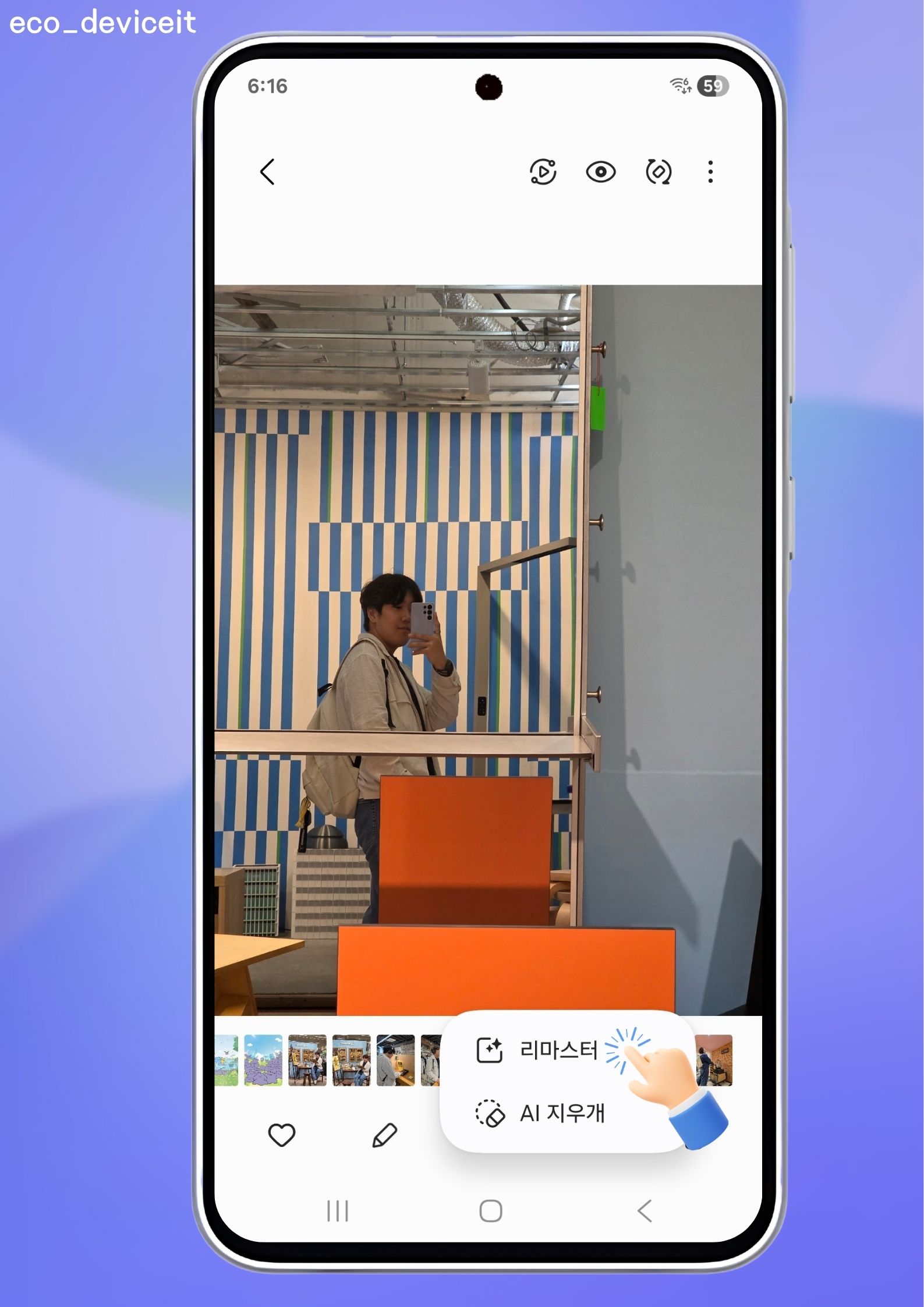 삼성 갤러리에서도 어썸 인텔리전스 기능을 지원합니다. 사진에서 원하는 물체를 지우는 AI 지우개와 저화질 사진을 고퀄리티 이미지로 재탄생시키는 사진 리마스터 기능을 제공하고 있습니다.