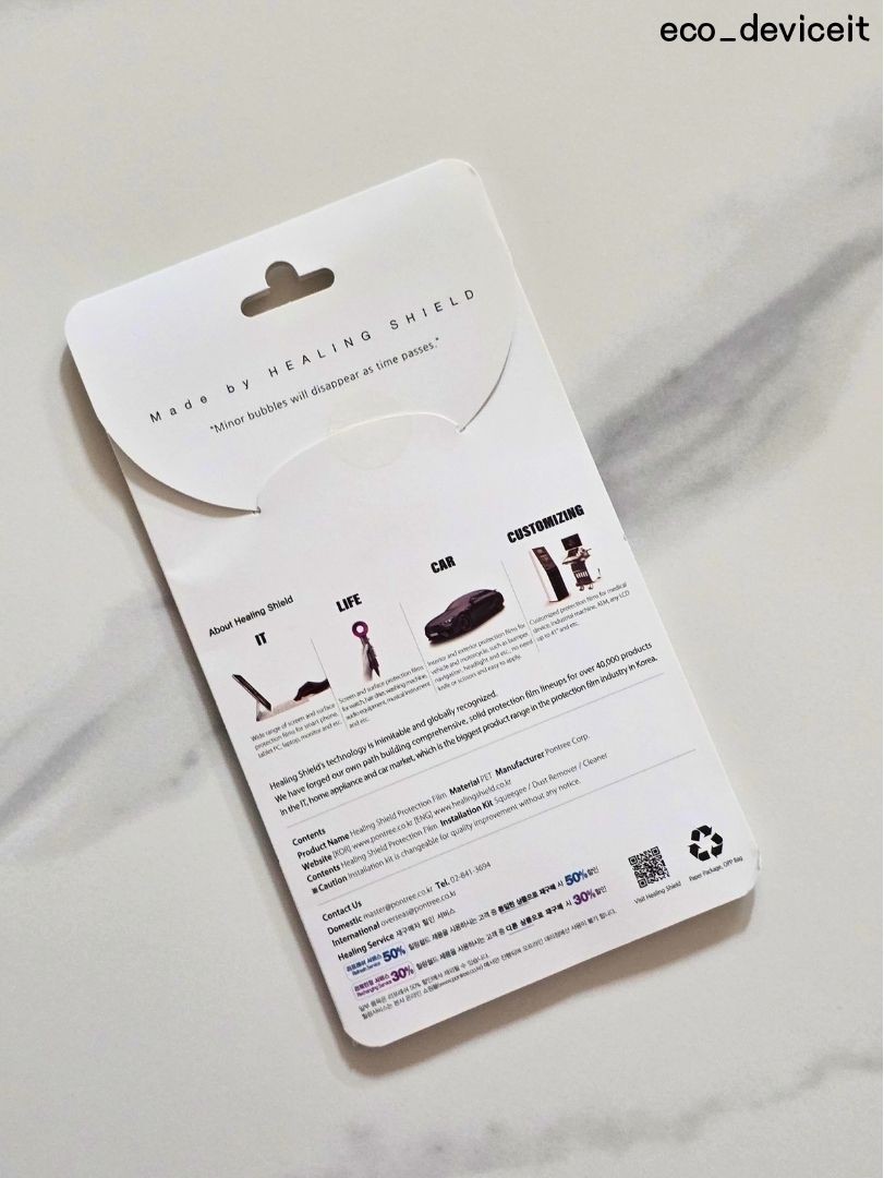 뒷면에는 간단하게 힐링쉴드에 대한 정보와 보호필름에 대한 제품 정보들이 작성되어 있네요!!