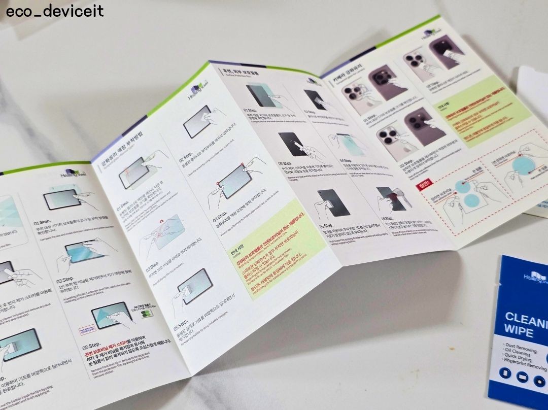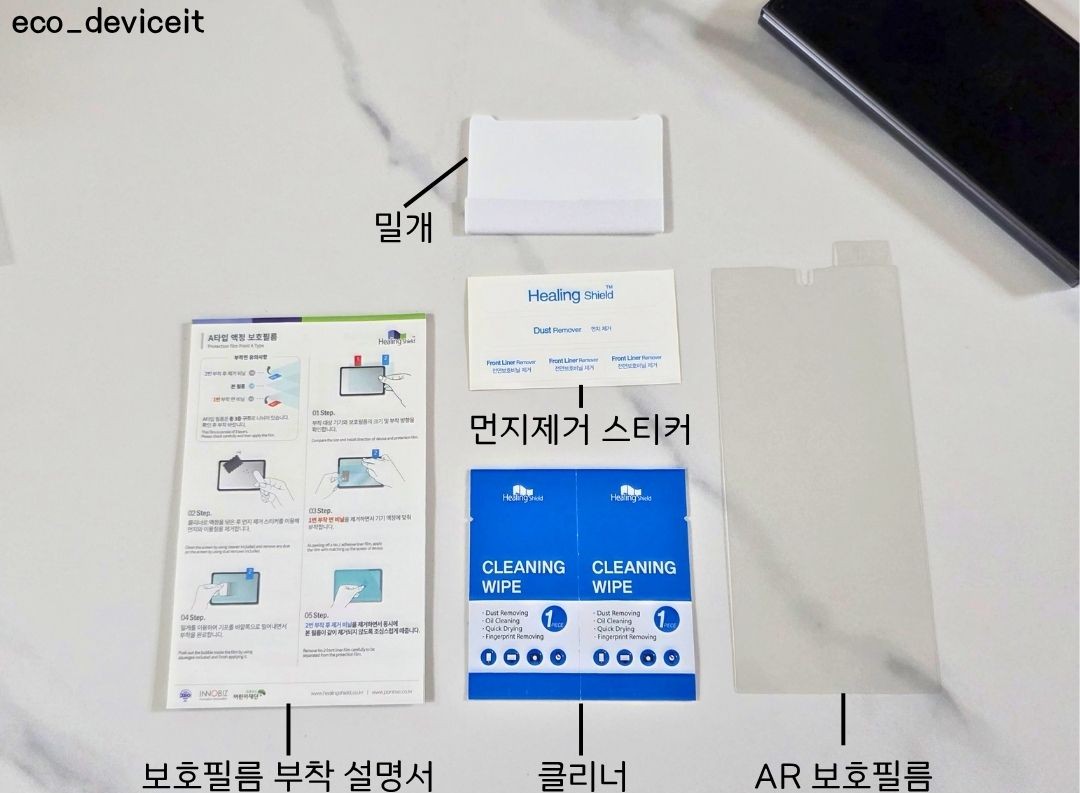 힐링쉴드 AR 고화질 보호필름 구성품의 경우, 좌측부터 보호필름 부착 설명서, 클리너, AR 보호필름, 먼지제거 스티커 그리고 밀개 등으로 구성되어 있습니다.
