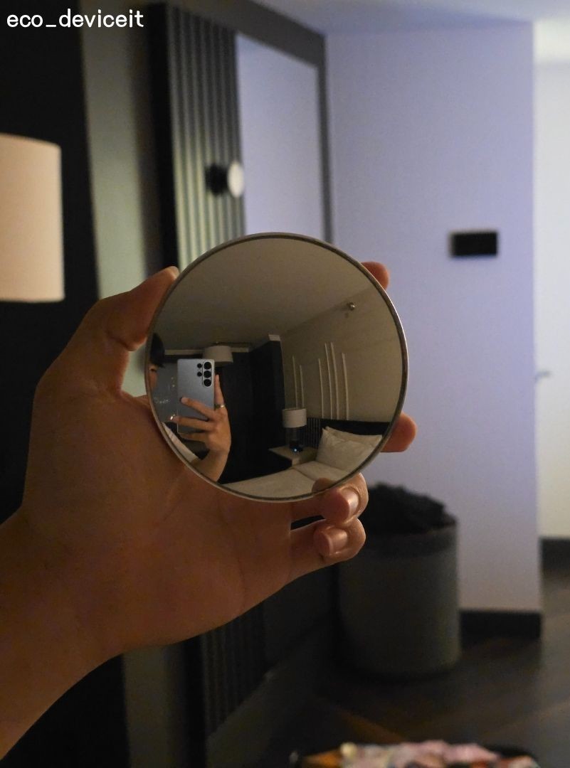 손거울부터 보겠습니다. 한 쪽에는 거울, 반대쪽에는 삼성멤버스 커넥트 행사 날짜가 함께 작성되어 있는 모습을 알 수 있습니다.