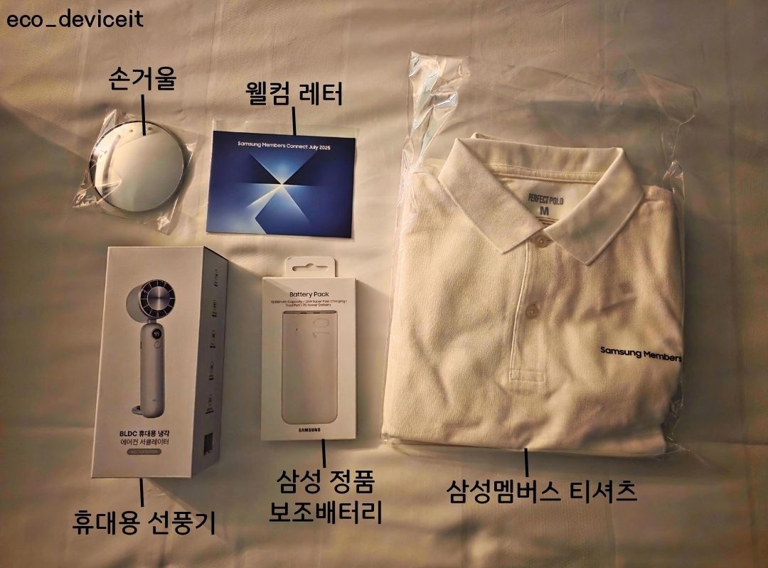 좌측 상단부터 시계 방향으로, 손거울, 웰컴 레터, 삼성멤버스 티셔츠, 삼성 정품 보조배터리 그리고 휴대용 선풍기 등으로 구성되어 있습니다.