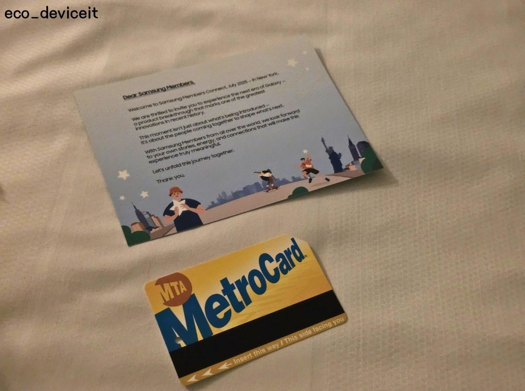 저는 곧 열리게 될 갤럭시 언팩 2025 행사 참석을 위하여 뉴욕에 오늘 도착하였습니다. 숙소에 도착하여 언팩 행사 관련한 명찰과 언팩 키트를 제공받을 수 있었습니다.