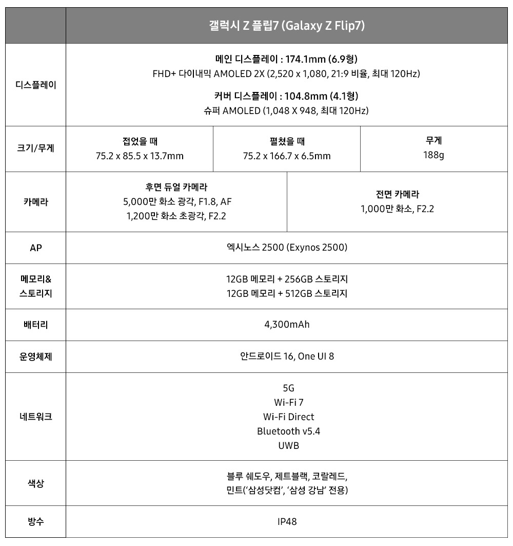 갤럭시 Z 플립7은 블루 쉐도우, 코랄레드, 제트블랙 3종으로 출시되며, 삼성닷컴과 ‘삼성 강남’에서만 구매 가능한 전용 색상인 민트 색상도 선보인다.