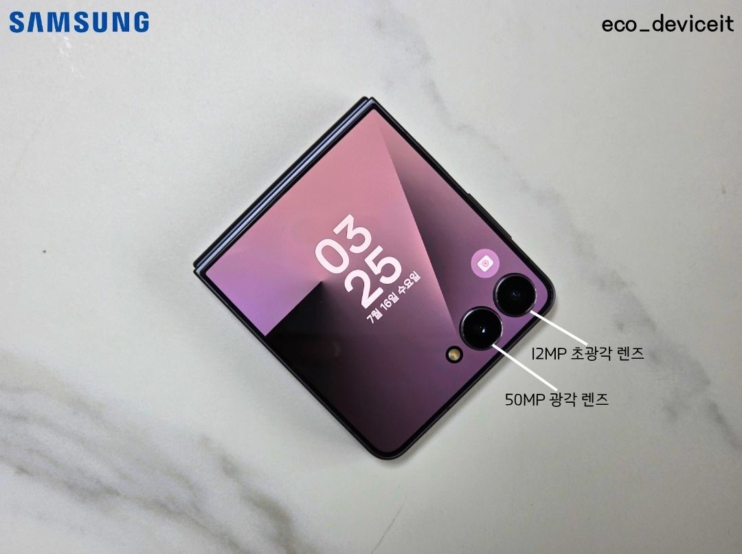 갤럭시 Z 플립7의 후면 카메라는 50MP 고화소의 광각 렌즈, 12MP 초광각 렌즈 조합이며 내부의 전면 카메라는 10MP 카메라로 구성되어 있습니다.