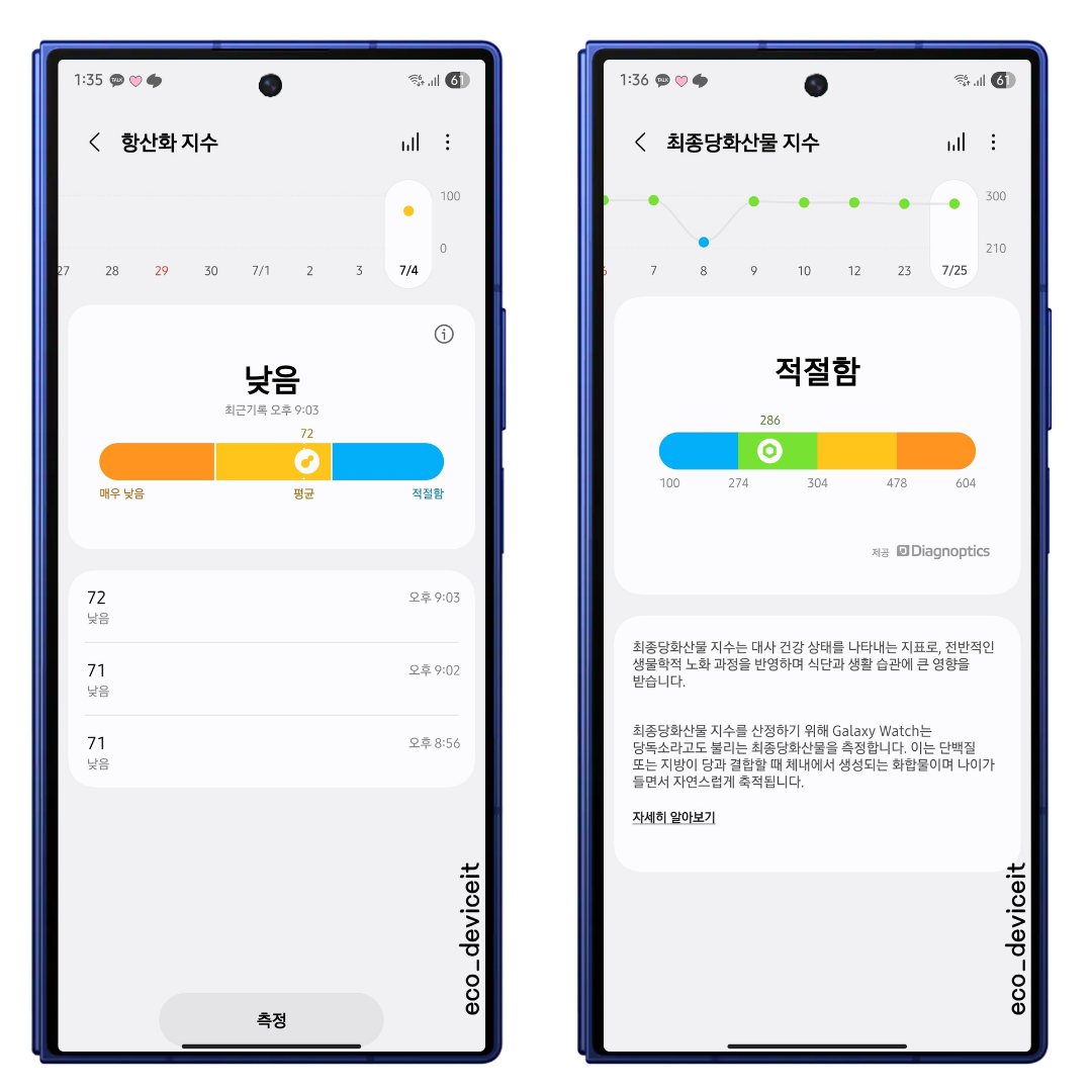 갤럭시 워치8 시리즈와 워치 울트라에서는 항산화 지수와 최종당화산물 지수를 측정할 수 있는 기능도 추가되었다는 것도 참고해두심 좋을거 같습니다.