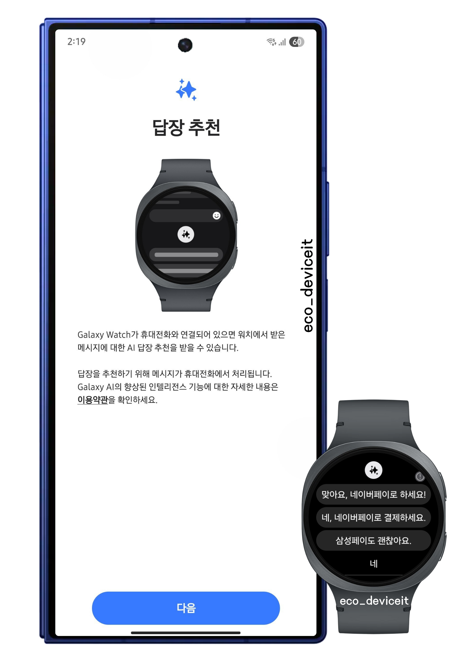 추가적으로 갤럭시 Z 폴드7에 탑재된 갤럭시 AI와 함께, 답장 추천 기능도 탑재되어 워치로 간단하게 채팅할 때 유용하더라고요!!