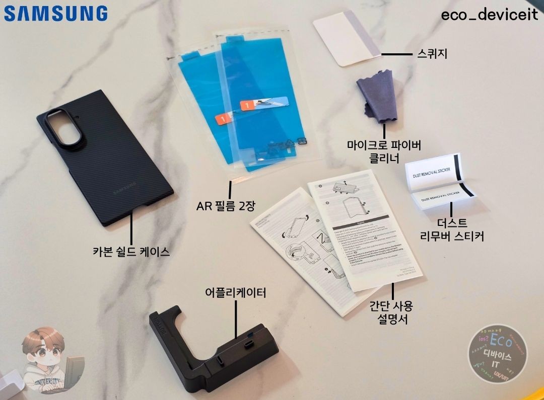 구성품은 좌측 상단부터 갤럭시 Z 폴드7 카본 쉴드 케이스, AR 필름 2장, 스퀴지, 마이크로 파이버 클리너, 더스트 리무버 스티커, 간단 사용 설명서 그리고 어플리케이터 등의 구성입니다.