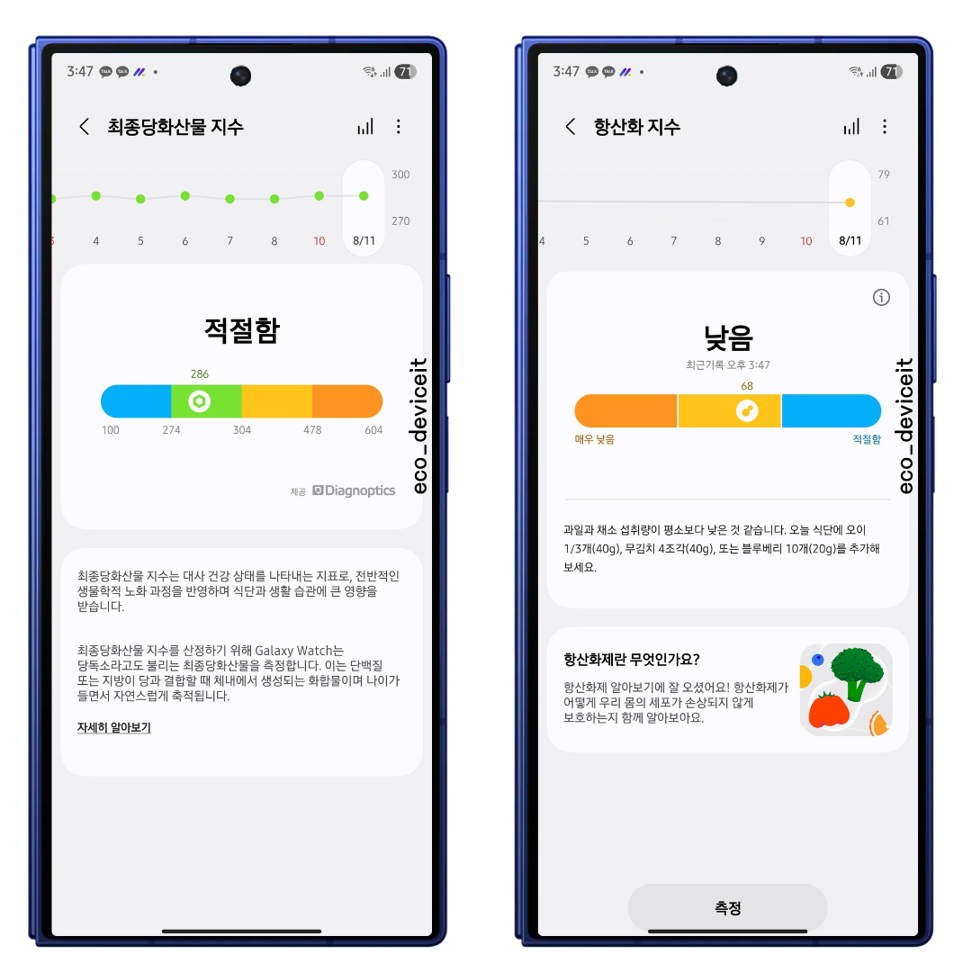 그 외에도 갤럭시 워치8 시리즈부터, 최종당화산물(AGEs)와 항산화 지수들을 측정할 수 있게 되었으며, 추가적으로 혈관 스트레스도 측정할 수 있습니다.