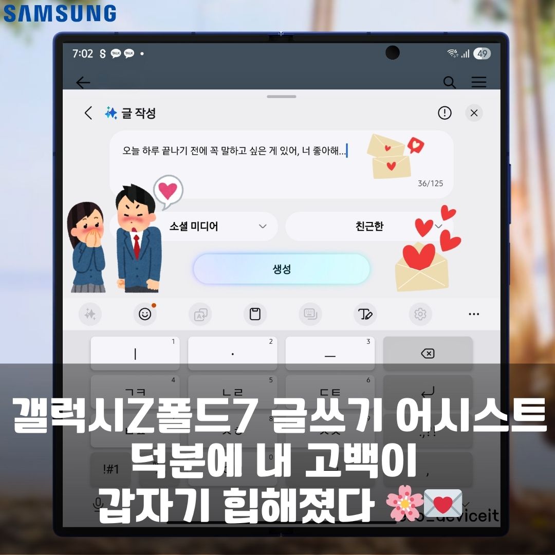 오늘은 갤럭시 Z 폴드7의 글쓰기 어시스트와 함께한 사랑 고백 꿀팁을 알려드렸는데요!! 어떠셨나요?? 이번 고백도 갤럭시 AI와 함께 성공하셨으면 좋겠습니다.
