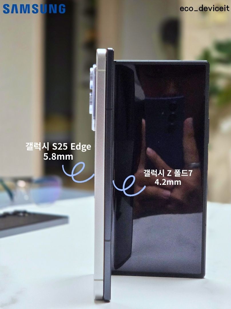 폴드7을 펼쳤을 때와 S25엣지와 두께 차이를 좀 더 자세히 보면 이러한 모습입니다. 5.8mm와 4.2mm와의 차이가 극명히 나타나죠.. 이번 폴드7이 진짜 하드웨어는 정말 미쳤어요!!