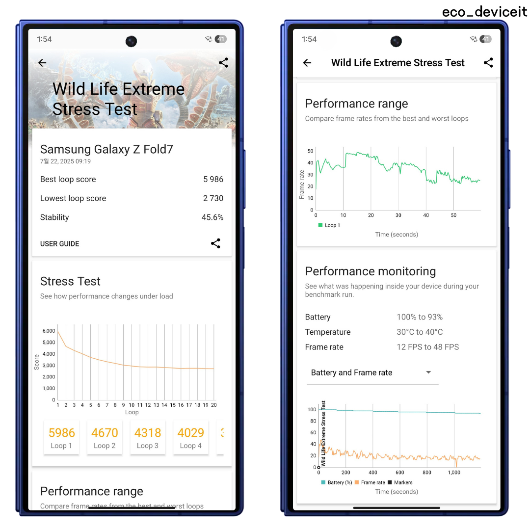 폴드7을 식혀놓고 3D mark Wild Life Stress 테스트도 진행해봤는데요. 역시 두께가 워낙 얇아서 최고점과 최저점이 동세대의 갤럭시 S25 울트라보다 아쉬운 결과를 나타냈습니다. 안정성도 역시 45%로 성능 유지력도 아쉬웠습니다.