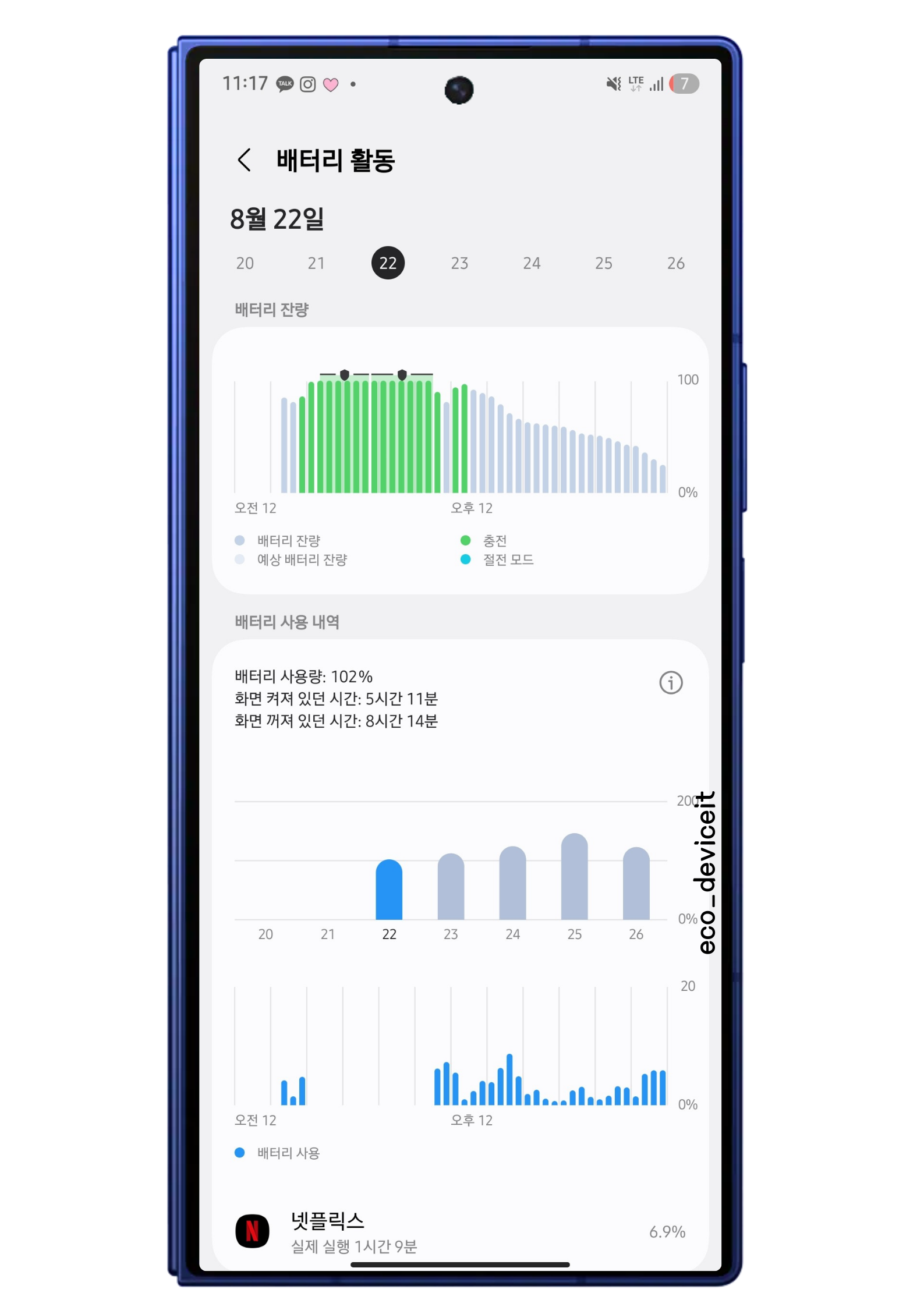 일반적인 사용환경으로 6시간 30분 정도 나타났고요. 게임이나 3D 작업을 하지 않는 이상, 폴드7의 배터리 타임은 무난하다고 볼 수 있습니다.