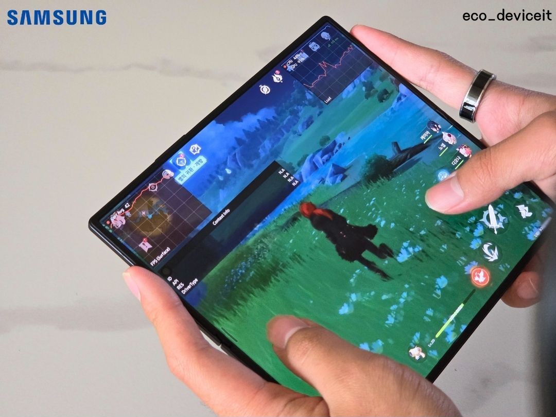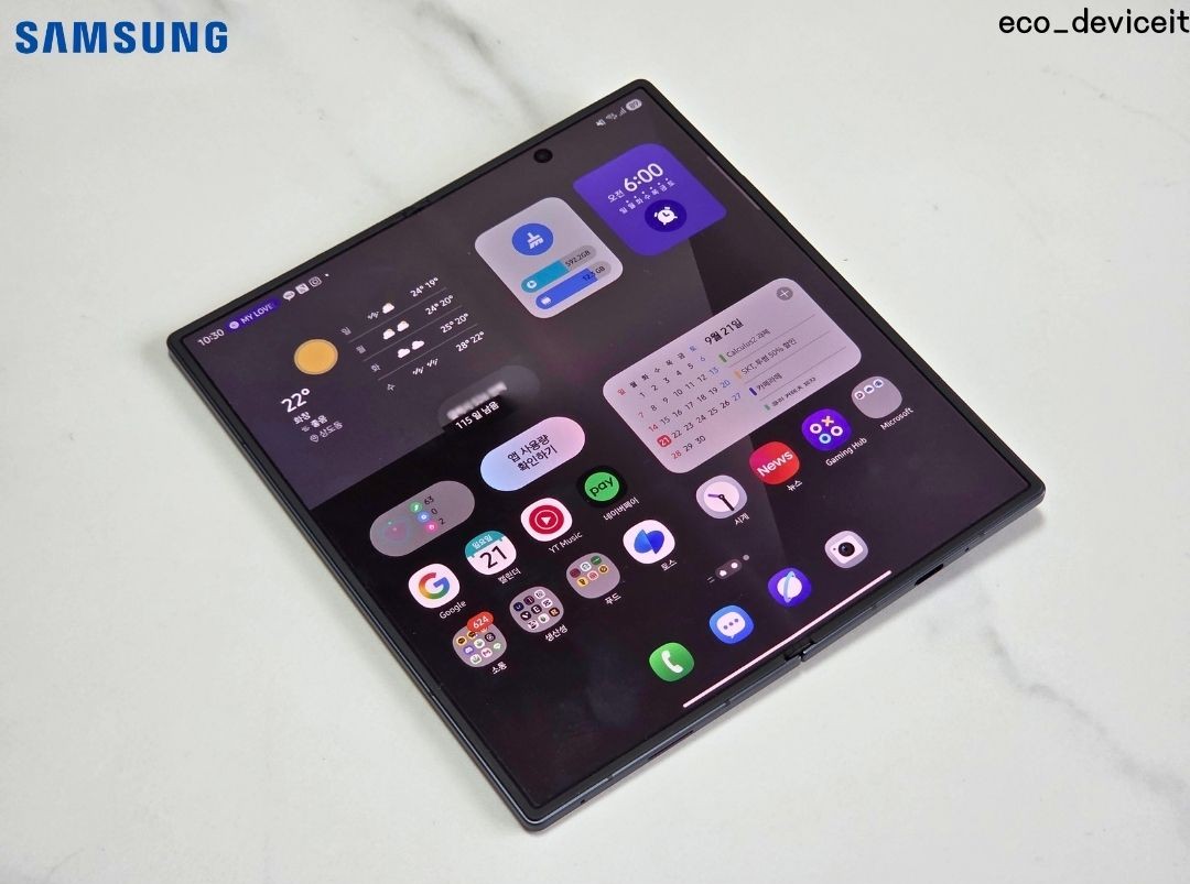 펼쳤을 때의 느낌은 위와 같습니다. 오히려 갤럭시 Z 폴드7은 펼쳤을 때의 디자인이 정말 매력적입니다. 디스플레이와 일체화된 블랙의 디자인이 저에겐 긍정적으로 다가왔습니다.