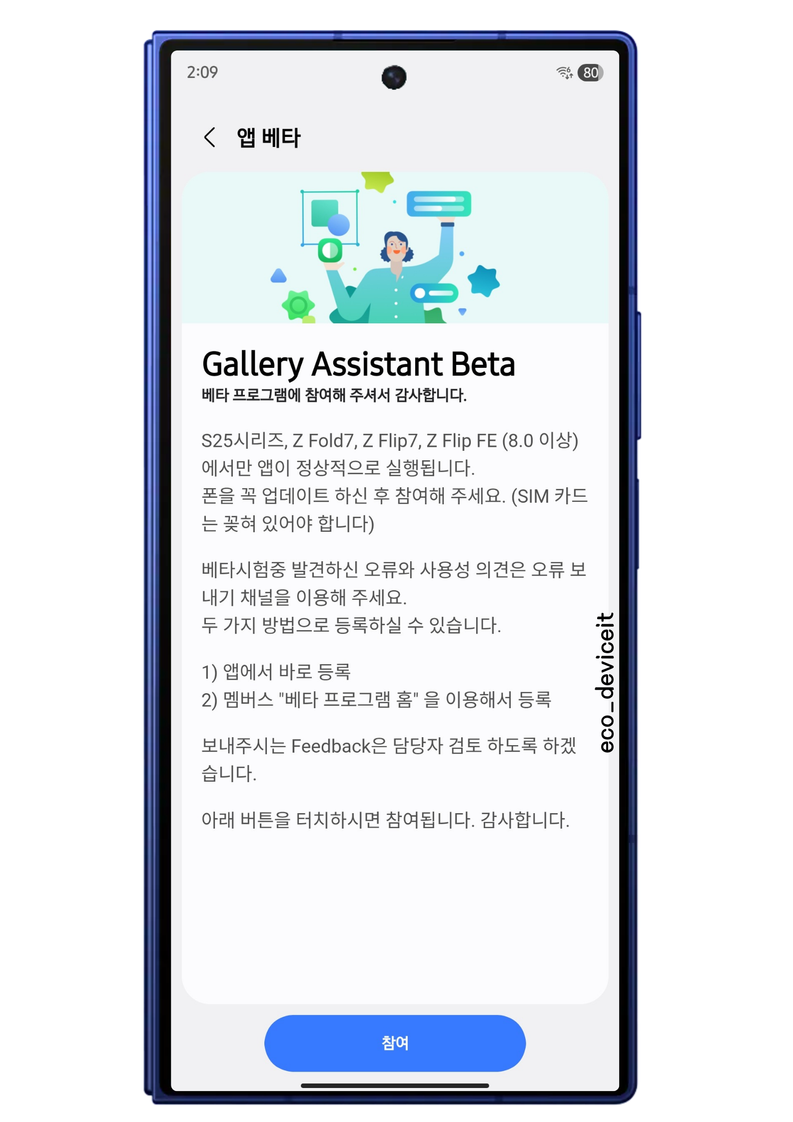 삼성멤버스 앱에서 갤러리 어시스턴트(Gallery Assistant) 베타 베너를 클릭 후, 베타 프로그램 홈에서 약관 동의 한 후 참여를 클릭해주세요.