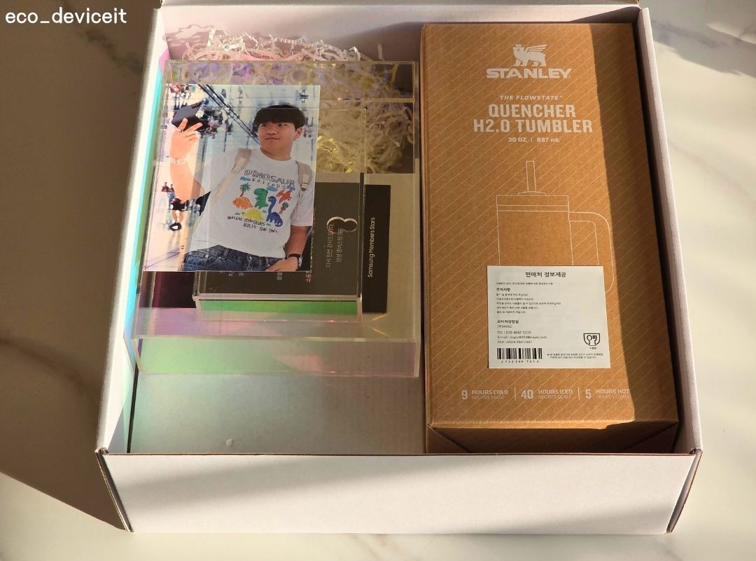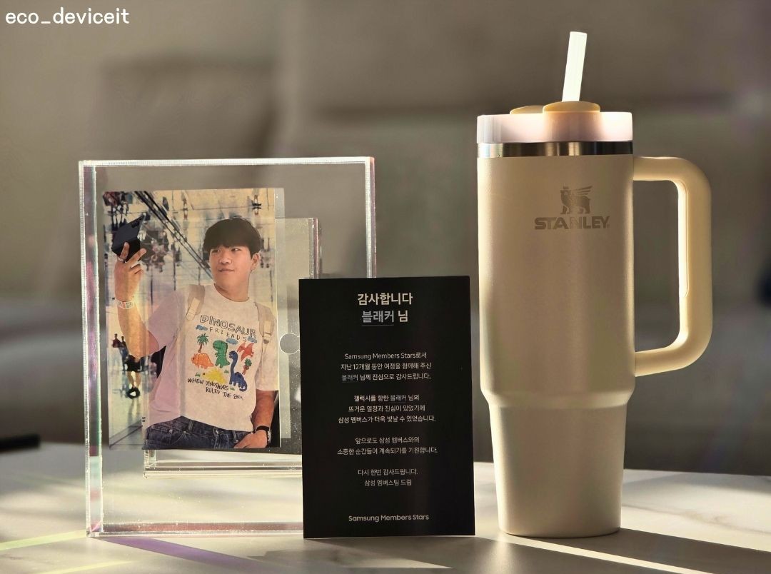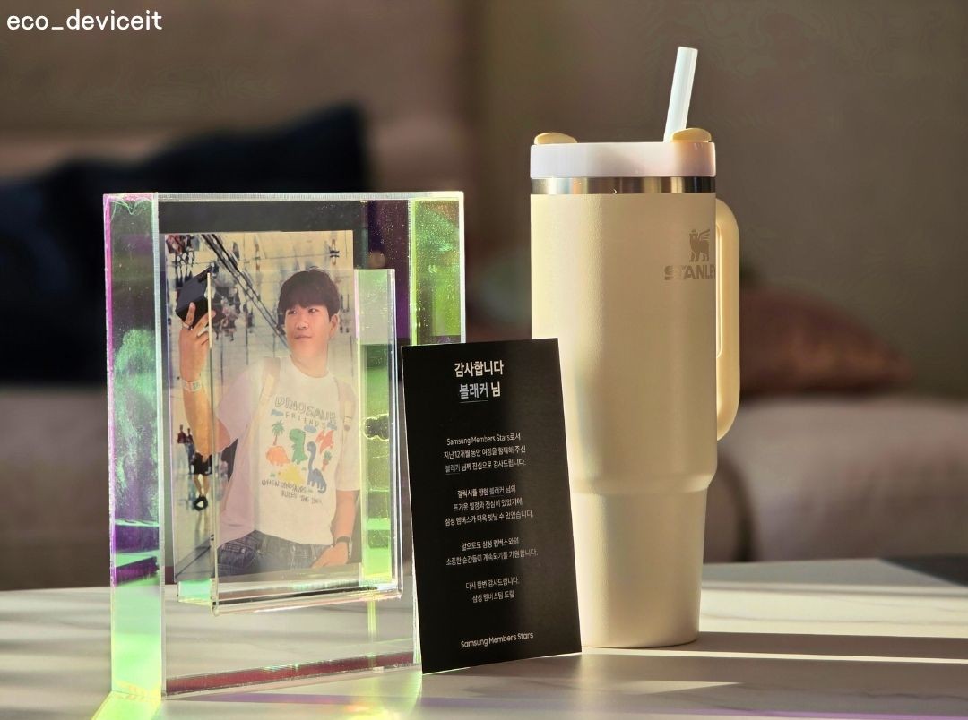 열어보니 가장 먼저, 하반기 삼성멤버스 커넥트 행사에서 폴드7과 함께 촬영된 제 모습이 눈에 들어오네요! 그리고 그 옆에는.. 전설의 스탠리 텀블러까지 자리하고 있습니다. ㅋㅋ