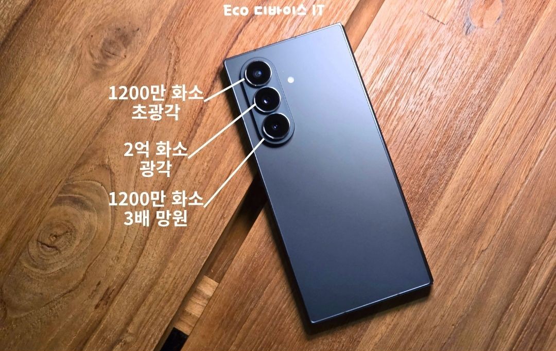 갤럭시 Z 폴드7의 카메라 구성은 상단부터 1200만 화소 초광각, 2억 화소 광각 그리고 1200만 화소 광학 3배 망원 카메라 조합입니다.