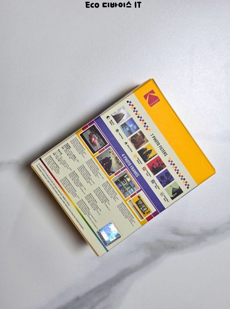 코닥 차메라 박스 뒷면엔 필터와 프레임 기능이 보기 쉽게 정리돼 있습니다. 노란 코닥 컬러와 도트 패턴 덕분에 레트로 감성 그대로 살아있는 디자인입니다.