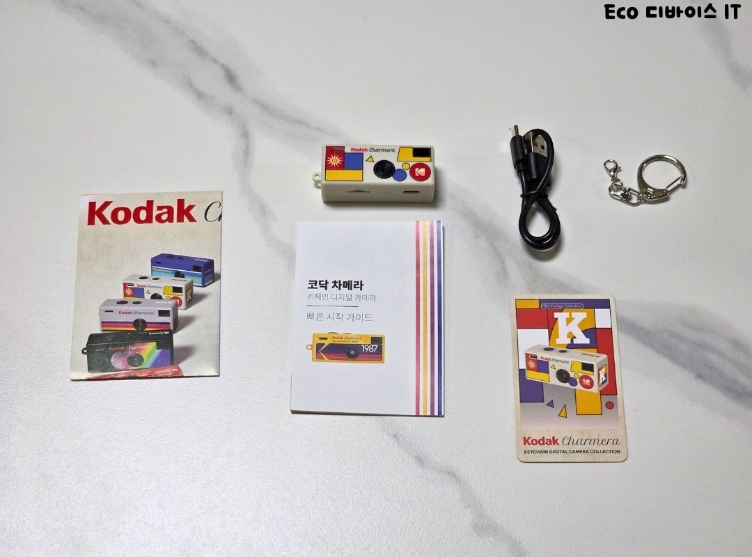코닥 차메라 키체인의 구성품은, 좌측부터 차메라 리플렛, 코닥 차메라 시작 가이드 설명서, 코닥 차메라 본체, 5W용 USB A to C 케이블, 차메라 ID 카드 그리고 키링으로 구성되어 있습니다.