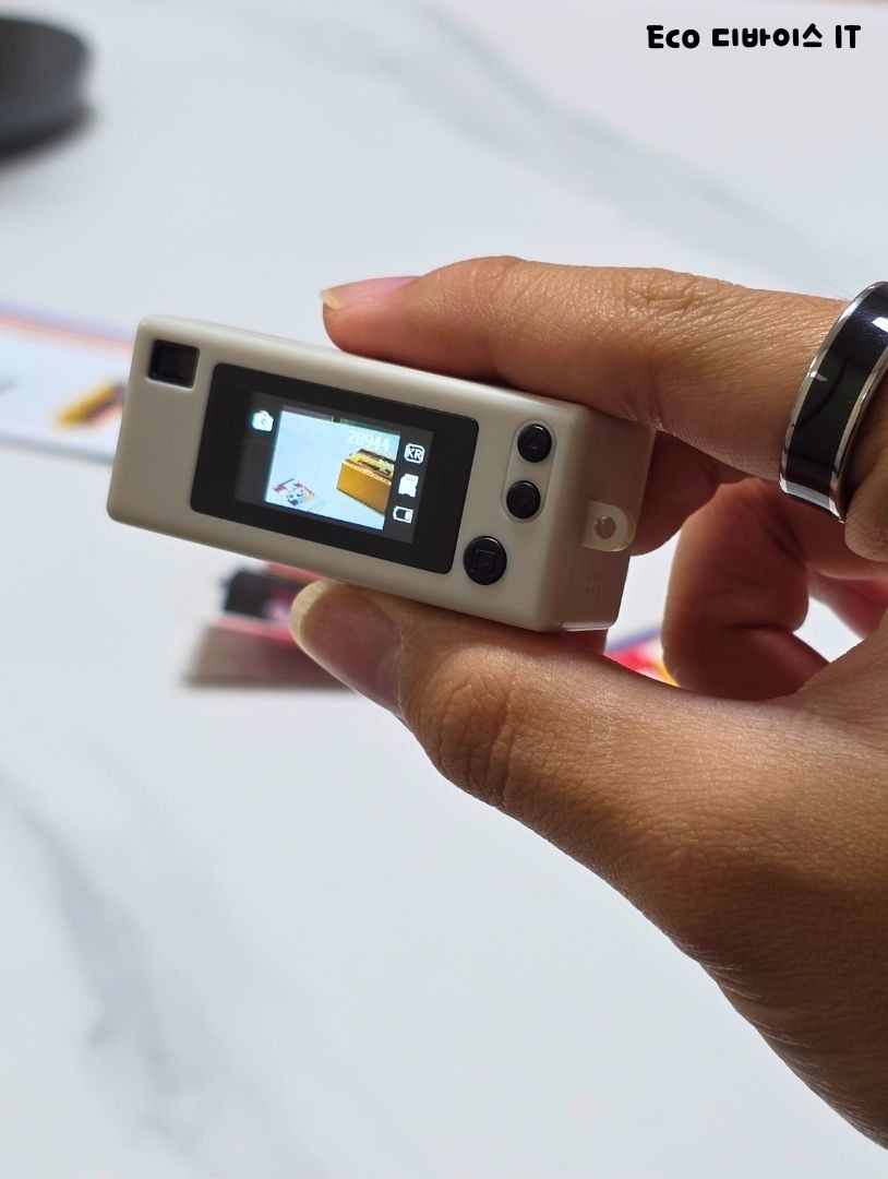 후면에는 완전 작은 LCD 화면과 메뉴 버튼들이 배치되어 있어 기본적인 사진 확인 및 설정 변경이 가능합니다. 미니 카메라지만 뒤쪽 구성은 실제 디지털 카메라와 비슷하네요.