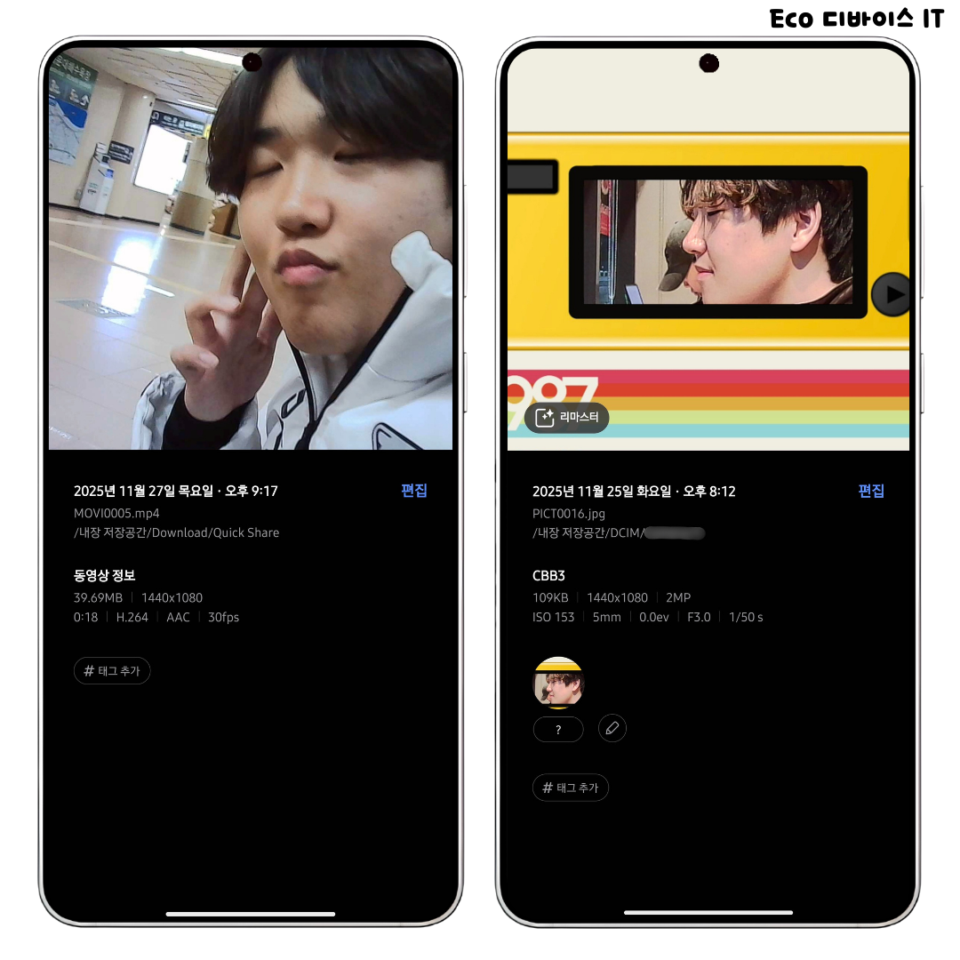 사진은 당연히 .jpg 코덱을 찍히고, 동영상은 AVI 코덱으로 저장됩니다. 위 사진은, 차메라로 찍고 나서 갤럭시 스마트폰으로 본 EXIF 정보인데요. 좌측은 MP4로 제가 변환한 부분임을 알려드립니다.