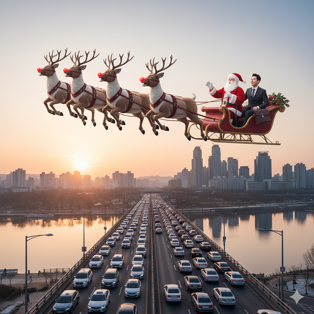 예시 2 (겨울 출근길): "루돌프가 끄는 산타 할아버지의 썰매에 산타 할아버지와 출근중인 직장인이 타고 있다. 썰매는 아침 출근길 꽉 막힌 반포대교 위를 날고 있다. 도로 위에는 차들로 가득해 보인다. 겨울이지만 상쾌한 아침 분위기, 기분 좋은 장면. 이미지 만들어줘"
