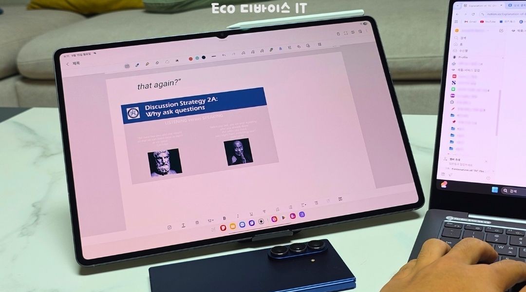 예를 들어, 갤럭시 북에 정리한 내용들을 갤럭시 탭 S11 울트라의 삼성 노트로 드래그 앤 드롭 기능을 활용하여 복사/붙여넣기 기능들으로 공부한 내용들을 정리할 수 있습니다.