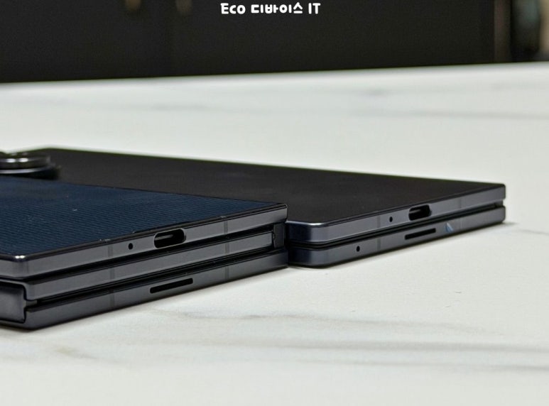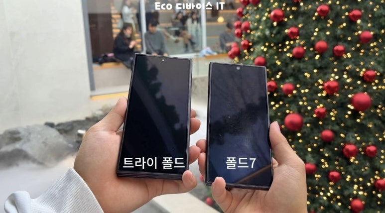 접었을 때의 두 모델의 두께도 비교해봤는데요. 이렇게 보니 갤럭시 Z 폴드7은 정말 슬림하고 캐주얼해졌다는게 느껴졌습니다. 트라이 폴드의 경우, 세 판을 모두 접다보니 힌지를 보았을 때, 두꺼운 모습을 알 수 있습니다.