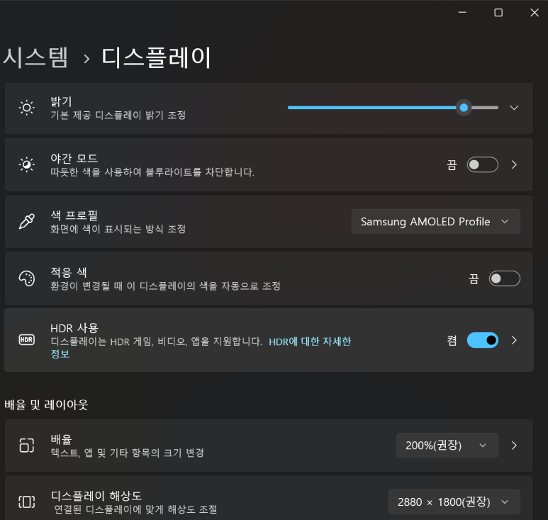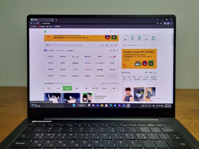 제가 이거 바로 켜자마자 좋았던것은 디스플레이가 정말 밝고 화질이 정말 좋더라구요?? 모바일에 관심이 많은 저에게도 정말 반가운 디스플레이 품질이었습니다. 제 기준으로 볼때는 디스플레이 품질만큼은 장담하실 수 있을꺼에요!! 하지만 단점을 하나 발견했는데 디스플레이가 글레어 되어있더라구요? 기존에 제가 쓰던 노트북은 논글레어라 그나마 불편하진 않았어요. 논글레어와 글레어와의 차이점이 뭐냐! 글레어는 말그대로 디스플레이의 저반사방지 코팅이 탑재되지 않아 유광의 느낌을 보여주는 것이고 논글레어는 저반사방지 코팅이 되어있어 빛반사에 있어서도 눈의 피로도와 부담감을 줄일 수 있는 차이점을 보여주고 있는 것이죠. 그래도 글레어로 처리를 하다보니 야외에서 디스플레이의 피크 밝기와 선명도는 만족하면서 썼기 때문에 깔끔한 글레어만의 장점도 갖고 있었습니다.