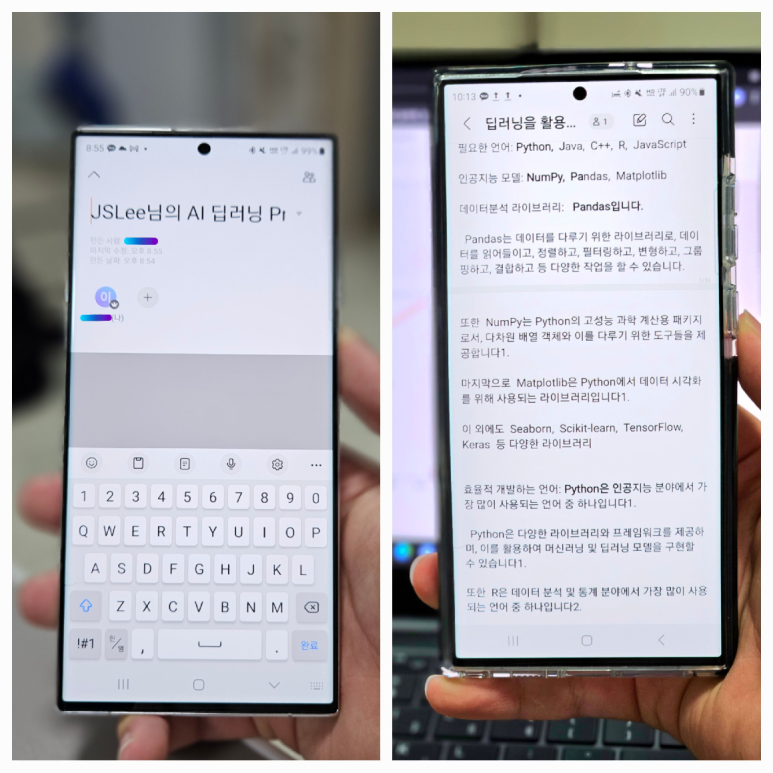 저는 삼성노트에 오늘 배웠던 내용, 복습, 예습 내용을 함께 정리를 하는데요.