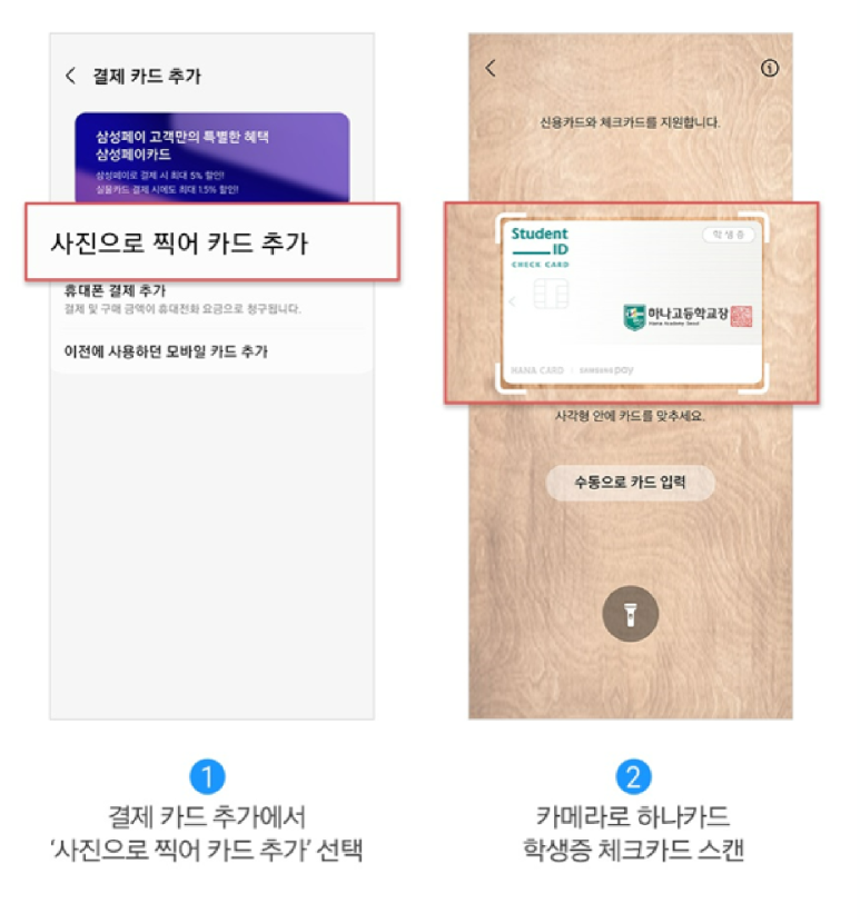 - 결제 카드 추가에서 사진으로 찍어 카드 추가 선택하여 하나카드 학생증 체크카드 스캔하기