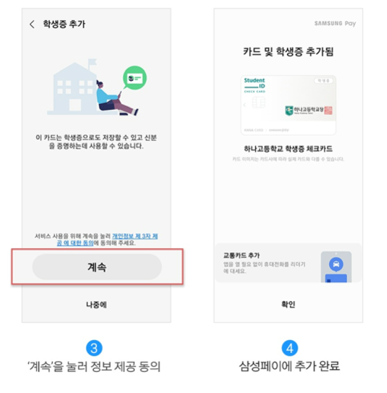 - 계속을 눌러 정보제공 동의후 삼성페이에 전자 학생증 추가하면 완료!