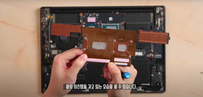 프로와 비교해도 차이가 날 정도의 사양이긴 하죠? 프로와 울트라의 내부 구조의 차이가 있다고 하더라고요? 프로는 히트파이프가 2개 탑재되어 있으면서 팬도 2개로 구성이 되어있습니다. 반면에 울트라는 베이퍼 챔버가 굉장히 크게 되어 있으면서 팬도 2개로 동일하게 탑재된 모습을 볼 수 있습니다. 확실히 그래픽과 CPU의 성능이 높다보니까 발열 컨트롤을 위해서 이렇게 큰 베이퍼 챔버를 구성한것 같습니다. 그리고 제가 앞에서 이 사양에 1.79kg면 가벼운 편이라고 했습니다.