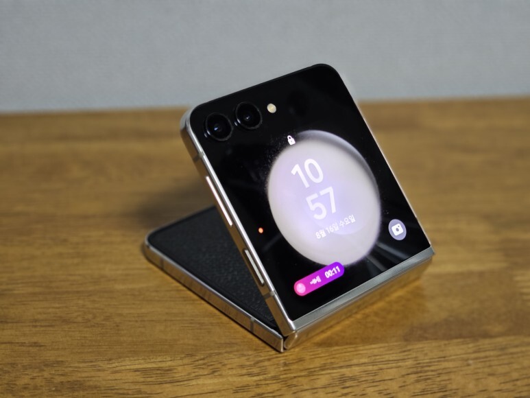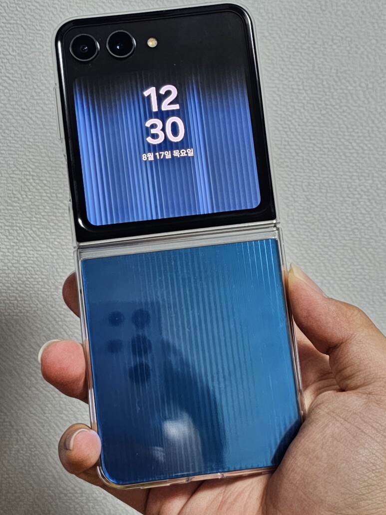 플립5의 디자인은 초반에 접혀있는 상태에서 커버디스플레이에 디스플레이만 있다보니 전작에 비해 심심하다는 생각이 들었는데 실제로 보니 디스플레이로 채우고 뒷쪽에 색을 입힌것도 1:1의 비율로 투톤의 디자인을 적용했다는 것이 인상적이었습니다. 전작은 색상을 여러가지 색상을 고를 수 있다는 것은 장점이었지만 후면에 애매한 크기의 커버디스플레이 때문에 윗쪽과 아랫쪽에 비율이 일정하지 않아서 저는 아쉬웠습니다. 이번 플립5는 아주 깔끔하게 윗쪽은 디스플레이로, 아랫쪽은 백글래스로 1:1 비율로 일정하여 이제 펼쳤을때의 뒷모습도 깔끔하고 많이 예뻐졌습니다!