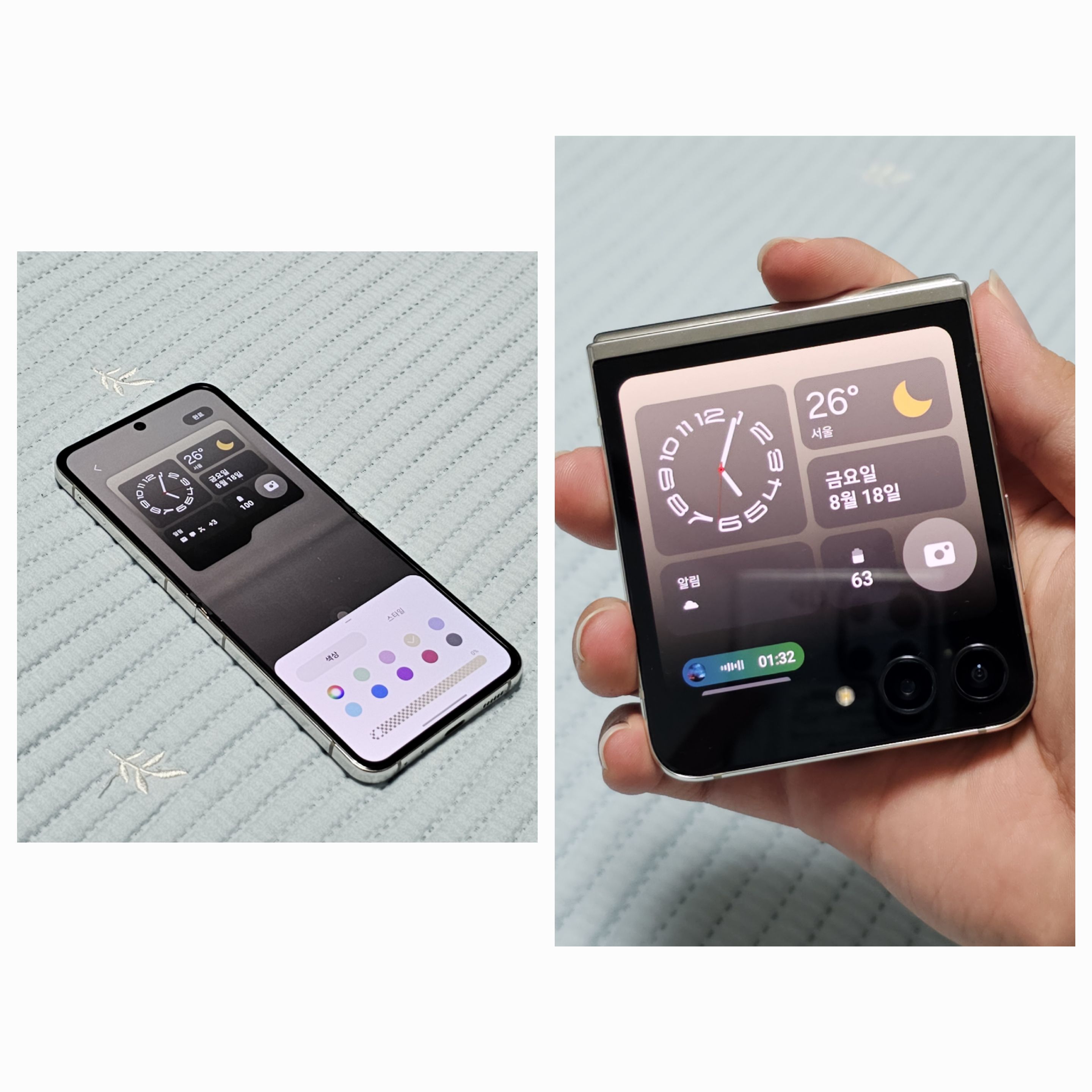 확장된 플렉스 윈도우의 활용을 제대로 활용할 수 있는 스타일인것 같습니다. 잠금화면의 알림 리스트 스타일도 다르고 AOD 스타일도 확실히 다르죠? 커진 화면 덕분에 간단하게 많은 정보들을 볼 수 있으면서 자신의 개성을 더한 이미지나 시계 스타일까지 세팅해주면 여러분도 갤럭시 Z 플립 5와 함께 힙쟁이가 될 수 있어요!