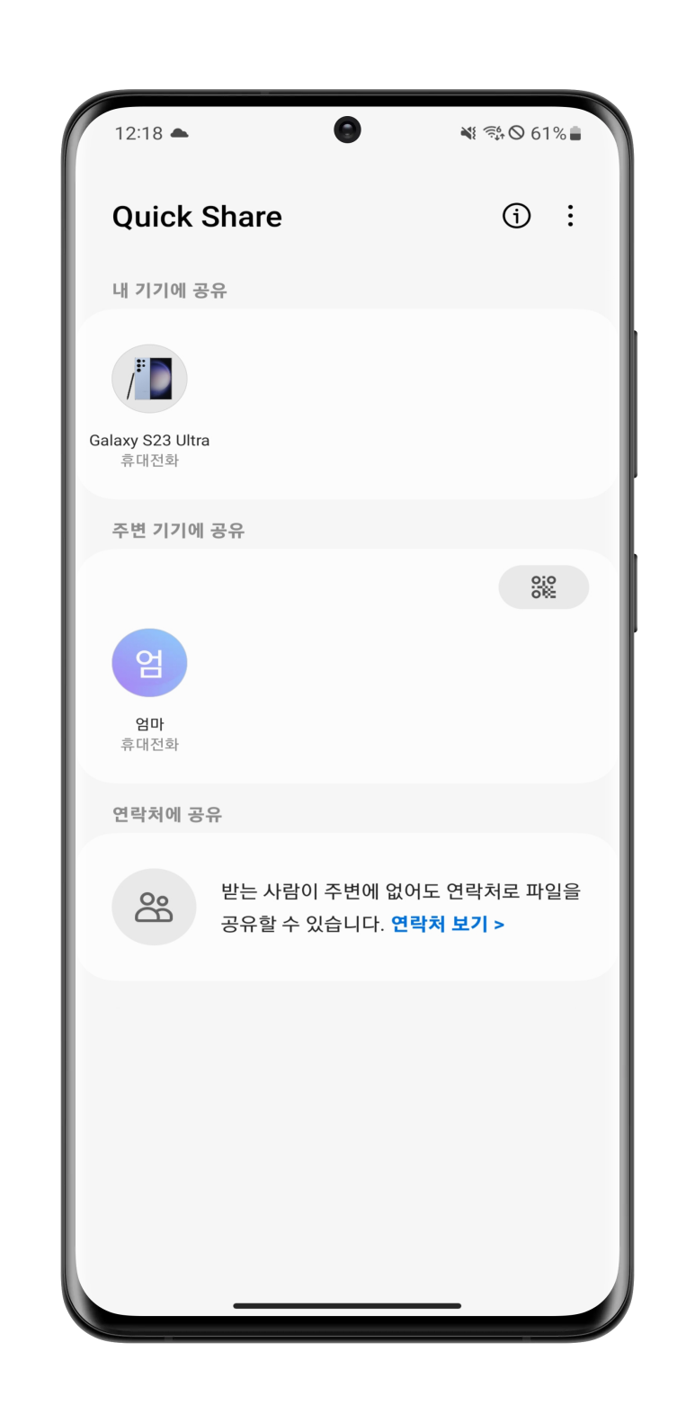 현재 사진을 보시면 내 기기면 내기기에 공유, 주변 기기에서 "엄마"라고 제가 연락처에 저장한 갤럭시 사용자가 나타나게 됩니다. 그래서 별도의 세팅없이 바로 클릭하면 전달할 수 있다보니 굉장히 편하게 공유할 수 있는것이죠!
