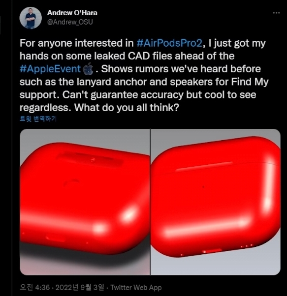 에어팟 프로 2세대 나의 찾기 추가 루머 2022.09.05 09:41 굿뉴스 글 작성자: Eco 디바이스 IT 728x90 반응형 에어팟 프로 2세대의 CAD도면 렌더링이 트위터 Andrew를 통하여 유출되었네요. 하단엔 라이트닝 포트로 유지를 할것으로 보이며, 하단엔 스피커로 추정되는 홀부분이 있는데 스피커를 활용하여 아이폰의 "나의 찾기"와 같은 기능으로 소리를 이용하여 케이스 자체까지 잊어버려도 한 번에 찾을 수 있을것으로 보이네요. 분실 부분에 있어서는 걱정이 덜 되기도 할것 같습니다. 728x90 반응형 공유하기 게시글 관리 Eco 디바이스 IT '굿뉴스' 카테고리의 다른 글 [New IT 소식!]갤럭시 Z 폴드2 | Z 플립 5G One UI 4.1.1 업데이트 배포! (2) 2022.09.24 [Beta 2] 갤럭시 S21 시리즈 One UI 5.0 베타2 배포!(ZVIB) (1) 2022.09.22 새로운 아이폰 14Pro 긱벤치 성능 공개 (0) 2022.09.09 갤럭시 Z 폴드3 | Z 플립3 OneUI 4.1.1 배포되었습니다. (0) 2022.09.05 갤럭시 S21시리즈 OneUI 5.0 베타 출시! (2) 2022.09.02 댓글 공유하기 다른 글 댓글 이 글 공유하기 구독하기 구독하기 카카오톡 카카오톡 라인 라인 트위터 트위터 Facebook Facebook 카카오스토리 카카오스토리 밴드 밴드 네이버 블로그 네이버 블로그 Pocket Pocket Evernote Evernote 다른 글 [Beta 2] 갤럭시 S21 시리즈 One UI 5.0 베타2 배포!(ZVIB) [Beta 2] 갤럭시 S21 시리즈 One UI 5.0 베타2 배포!(ZVIB) 2022.09.22 새로운 아이폰 14Pro 긱벤치 성능 공개 새로운 아이폰 14Pro 긱벤치 성능 공개 2022.09.09 갤럭시 Z 폴드3 | Z 플립3 OneUI 4.1.1 배포되었습니다. 갤럭시 Z 폴드3 | Z 플립3 OneUI 4.1.1 배포되었습니다. 2022.09.05 갤럭시 S21시리즈 OneUI 5.0 베타 출시! 갤럭시 S21시리즈 OneUI 5.0 베타 출시! 2022.09.02 다른 글 더 둘러보기