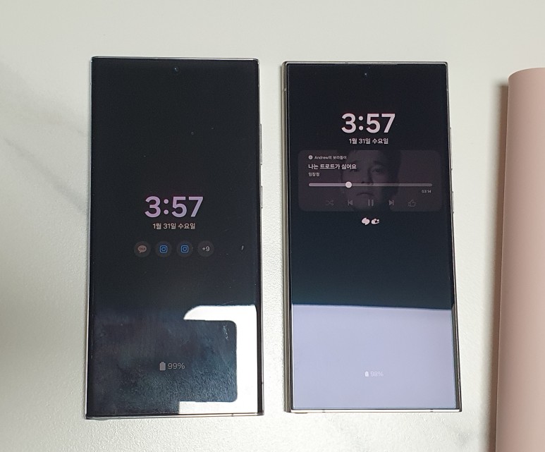 갤럭시 S24울트라는 코닝의 고릴라 글래스 아머 소재를 탑재했습니다. 전작 대비 75% 향상된 반사방지 처리가 들어갔다고 합니다. 그래서 동일한 빛의 환경에서 보니 확연한 차이를 볼 수 있었고 밝은곳에서 쨍하면서 글래어 특유의 화질저하 또한 많이 좋아졌습니다.