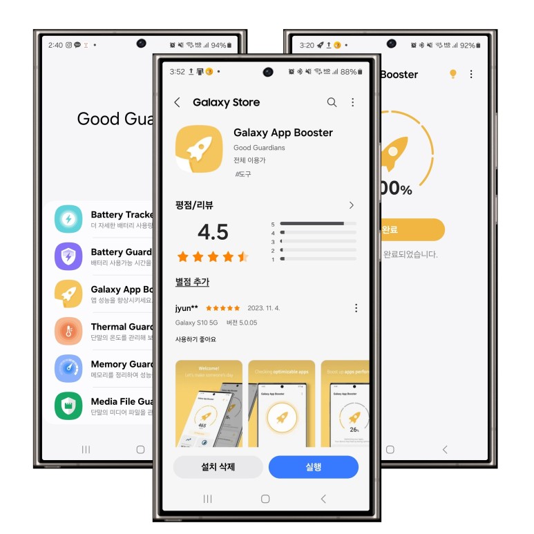갤럭시 스마트폰에 기본적으로 탑재되어 있는 갤럭시 스토어에서 검색창에 Good Guardians 앱을 설치 후 Galaxy App Booster를 설치하실 수 있습니다.