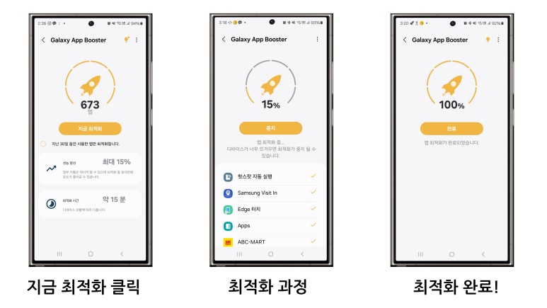 앱 부스터에서 만약 최적화를 했을때의 성능 향상폭이 15%라면, 최적화를 권장드리고 백그라운드로 진행하기 때문에 최적화를 진행하면서 다른 앱을 사용하실 수 있습니다.