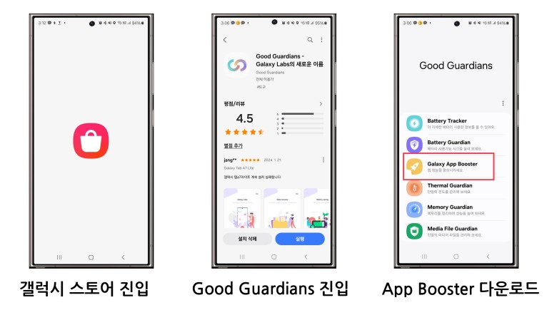 갤럭시 스마트폰에 기본적으로 탑재되어 있는 갤럭시 스토어에서 검색창에 Good Guardians 앱을 설치 후 Galaxy App Booster를 설치하실 수 있습니다.