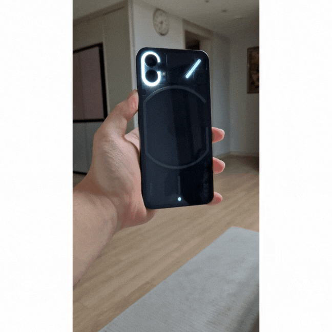 낫싱을 구매하신 이유 중 가장 큰 이유중 하나죠! 낫싱은 후면 소재를 투명하게 처리를 했고 후면에 974개의 LED가 들어가 이렇게 감성적이고 깐지나는 효과를 맛볼 수 있습니다.