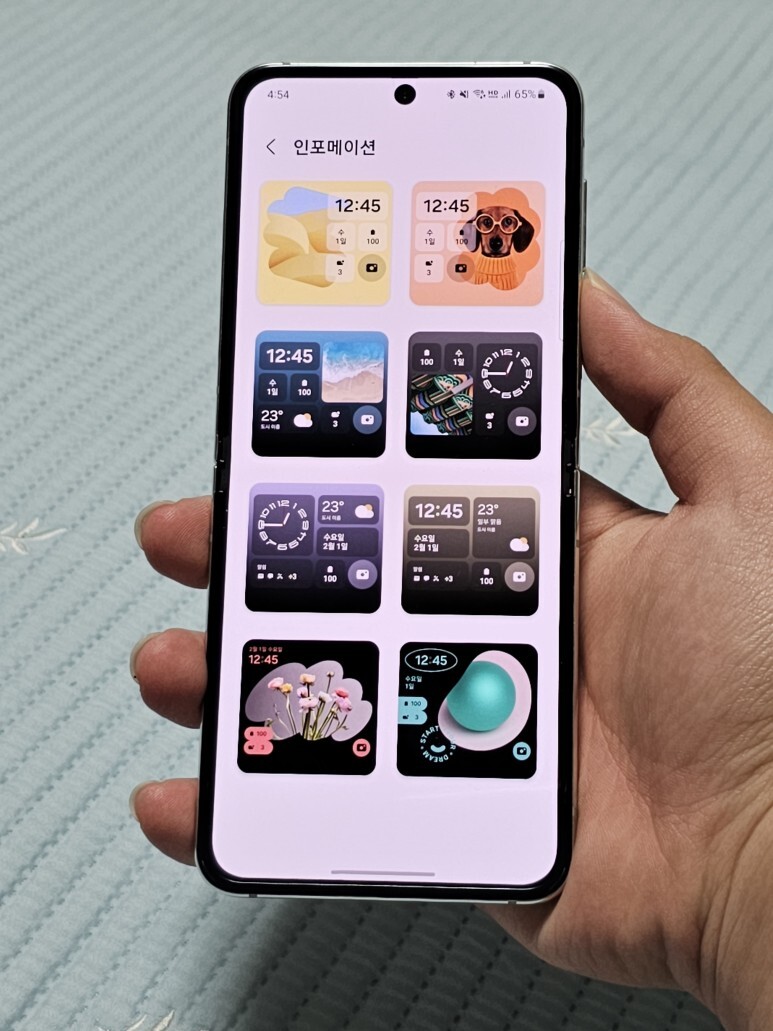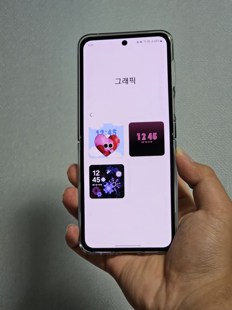 플렉스 윈도우의 잠금화면을 설정 최대한 디테일하게 꾸밀 수 있어요! 이건 내가 잠금화면의 시계 스타일, 배경, 그래픽, 위젯 배치도, 알림 아이콘 등을 다양하게 세팅할 수 있어요! 기본적으로 제공하고 있는 디자인이 상당히 많죠? 그중에서 저는 그래픽과 인포메이션을 이용할꺼에요. 왜냐하면 다른 옵션들은 일반 바형 스마트폰에서도 사용할 수 있기때문에 플립5만의 개성을 뽐내봐야하잖아요!
