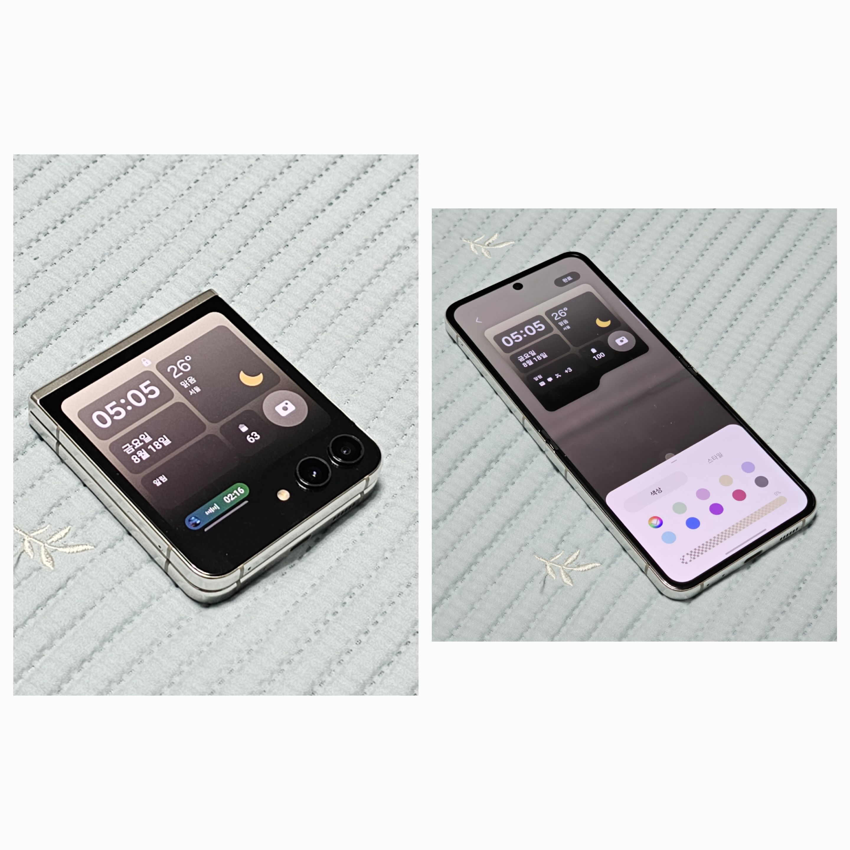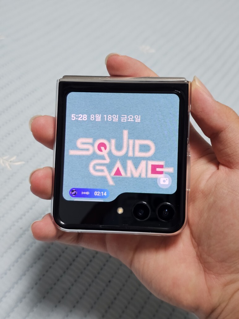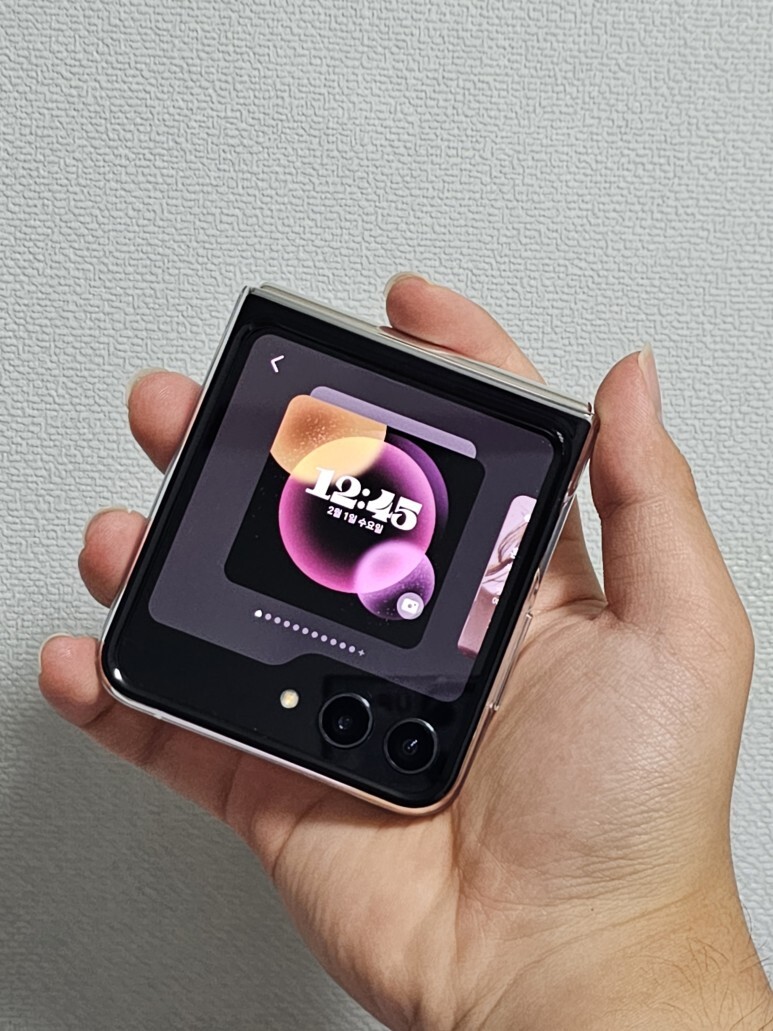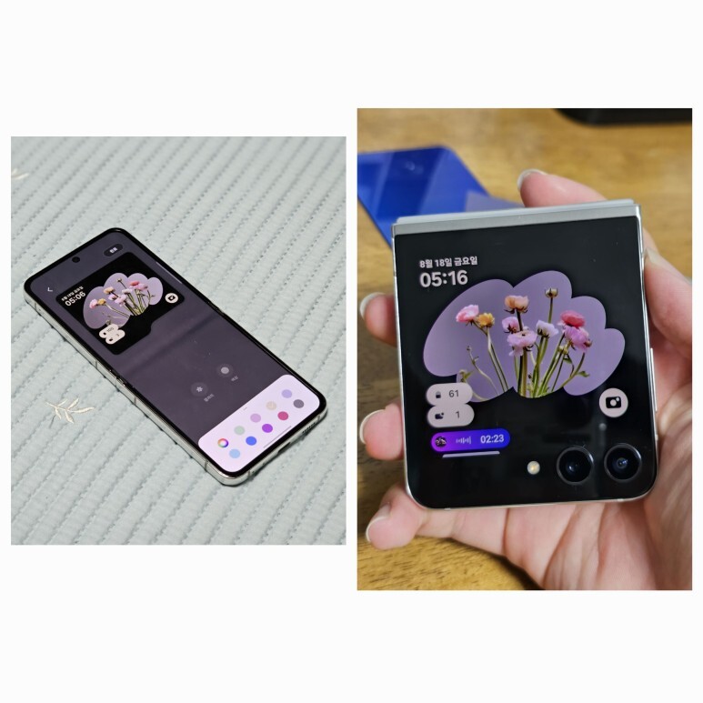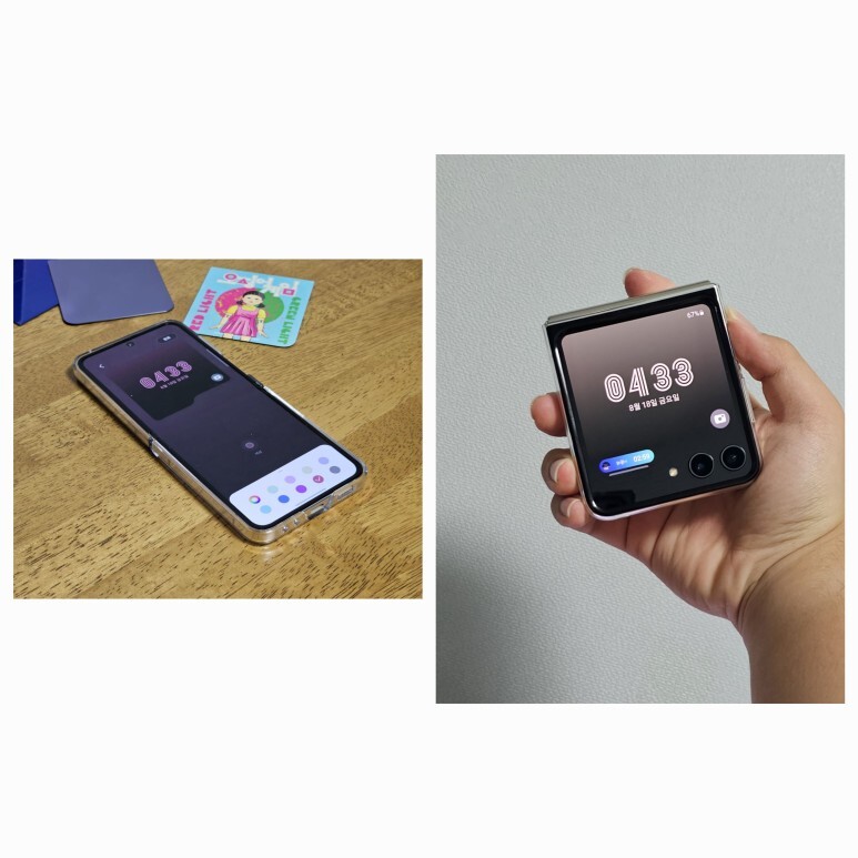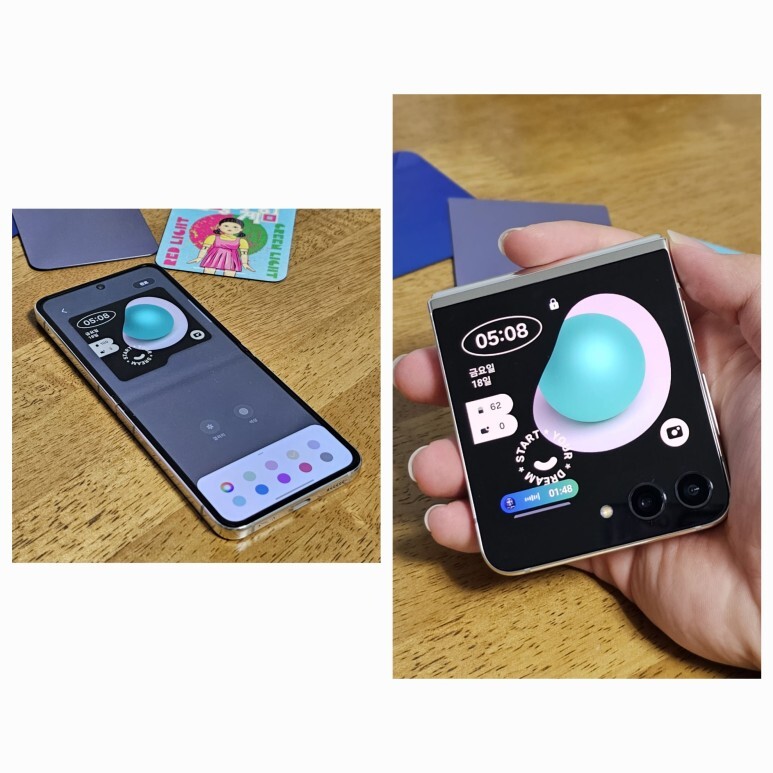 확장된 플렉스 윈도우의 활용을 제대로 활용할 수 있는 스타일인것 같습니다. 잠금화면의 알림 리스트 스타일도 다르고 AOD 스타일도 확실히 다르죠? 커진 화면 덕분에 간단하게 많은 정보들을 볼 수 있으면서 자신의 개성을 더한 이미지나 시계 스타일까지 세팅해주면 여러분도 갤럭시 Z 플립 5와 함께 힙쟁이가 될 수 있어요!