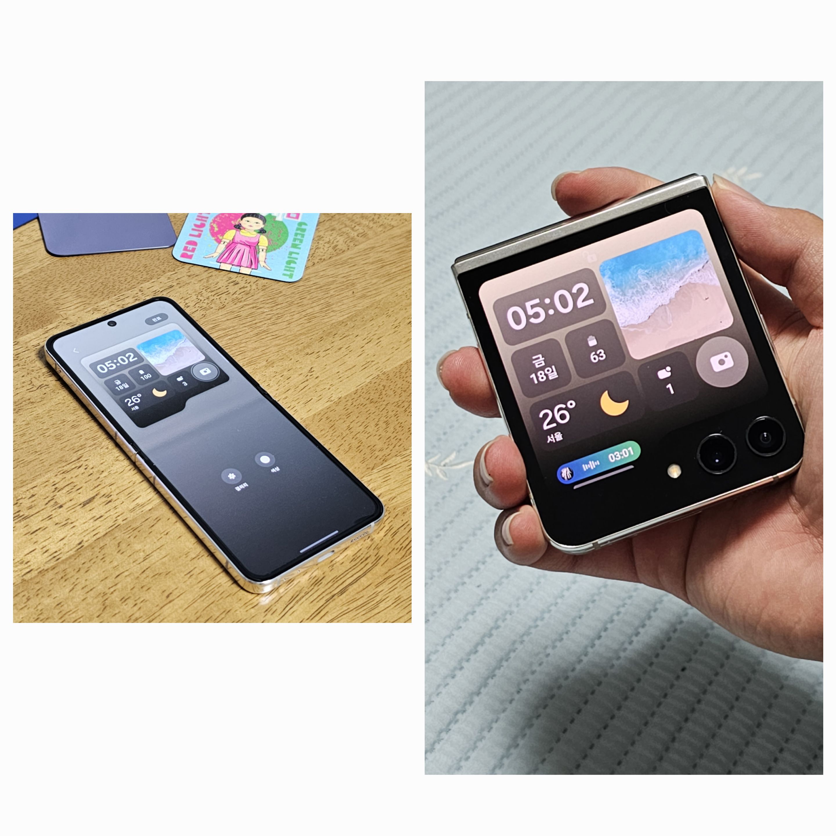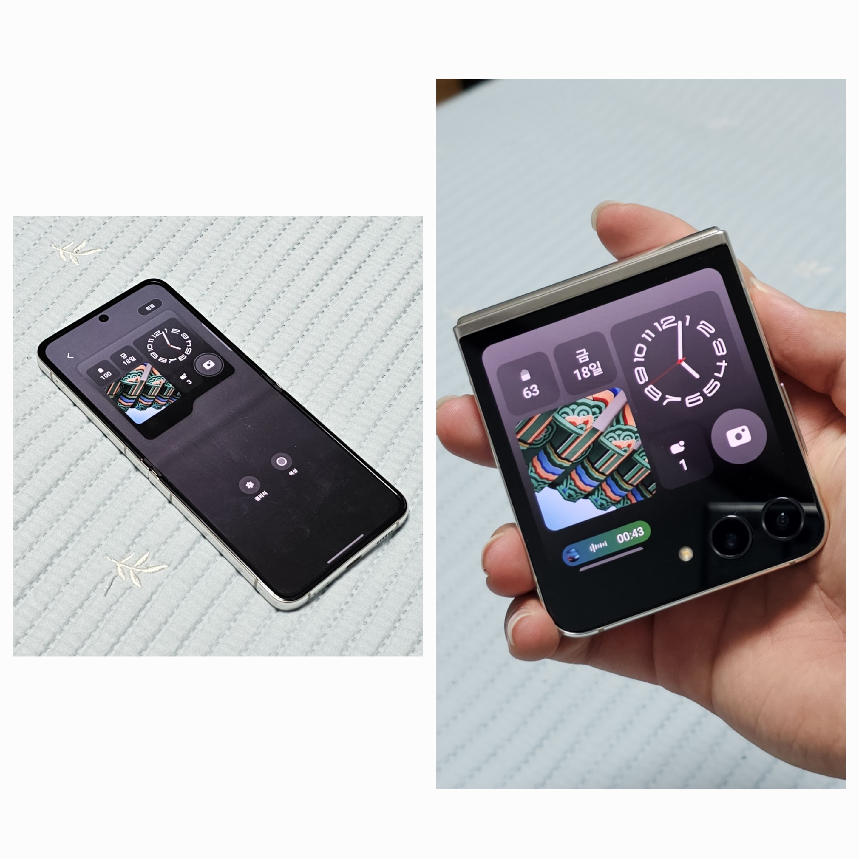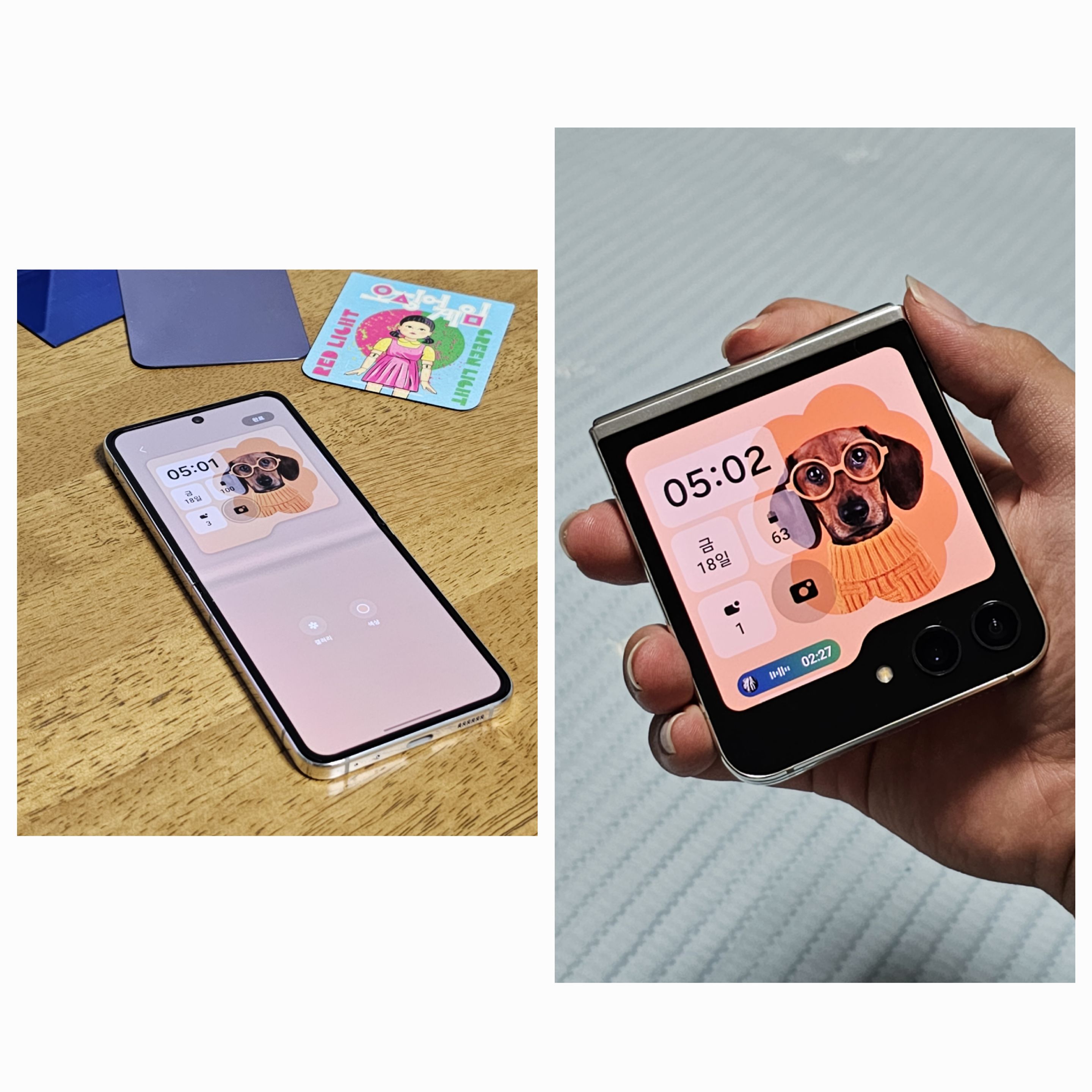 확장된 플렉스 윈도우의 활용을 제대로 활용할 수 있는 스타일인것 같습니다. 잠금화면의 알림 리스트 스타일도 다르고 AOD 스타일도 확실히 다르죠? 커진 화면 덕분에 간단하게 많은 정보들을 볼 수 있으면서 자신의 개성을 더한 이미지나 시계 스타일까지 세팅해주면 여러분도 갤럭시 Z 플립 5와 함께 힙쟁이가 될 수 있어요!